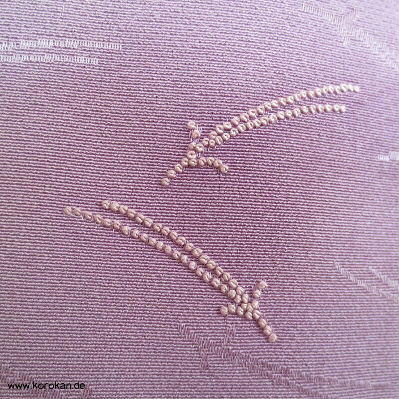 Vintage Seidendamast Komon / Tsukesage Kimono wolkiger Kiefernnadel gewebt und gestickt, hellem oberen Seidenfutter, unterem Seiden Hakkake dunkelmauve Verlaufsrand Seidencrepe.