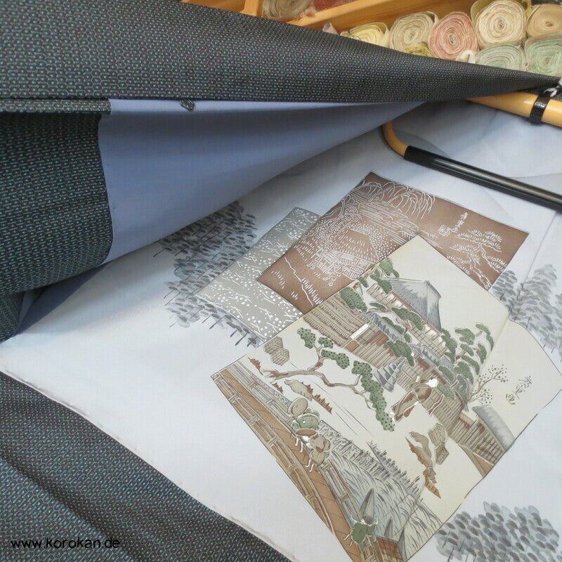 Vintage japanische Männer Haori aus hellblau - brauner feiner Kasuri garngefärbter Kikko Tsumugi Seide mit Seidenfutter Bild Shikishi