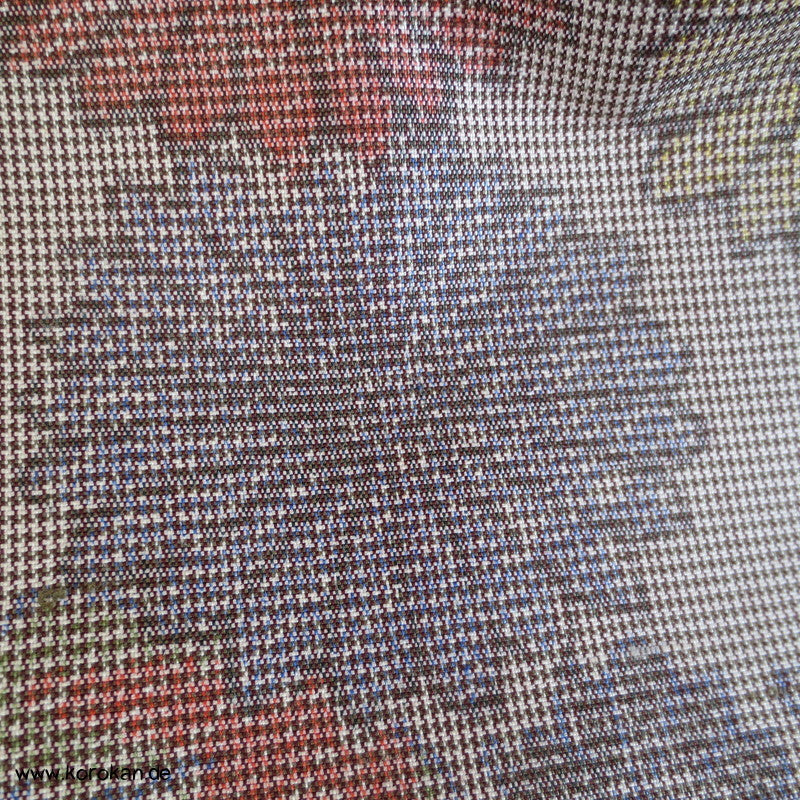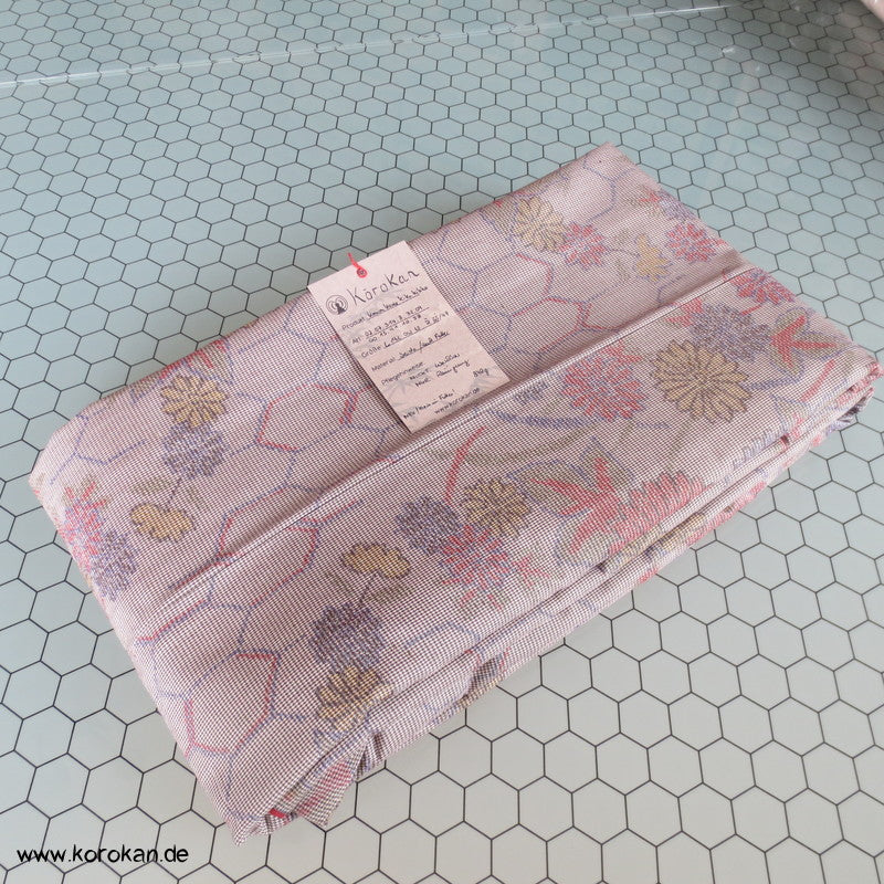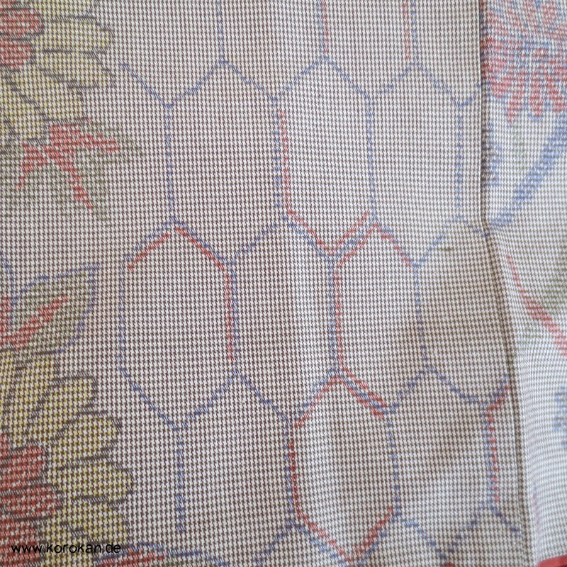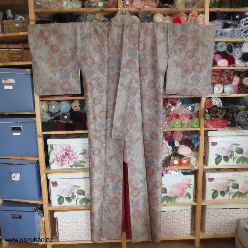 Vintage Tsumugi Seide Komon Kasuri Chrysanthemen Kiku in Kikko Sechsecken, oberes Futter helle Seide, unteres Hakkake Futter Seide rot