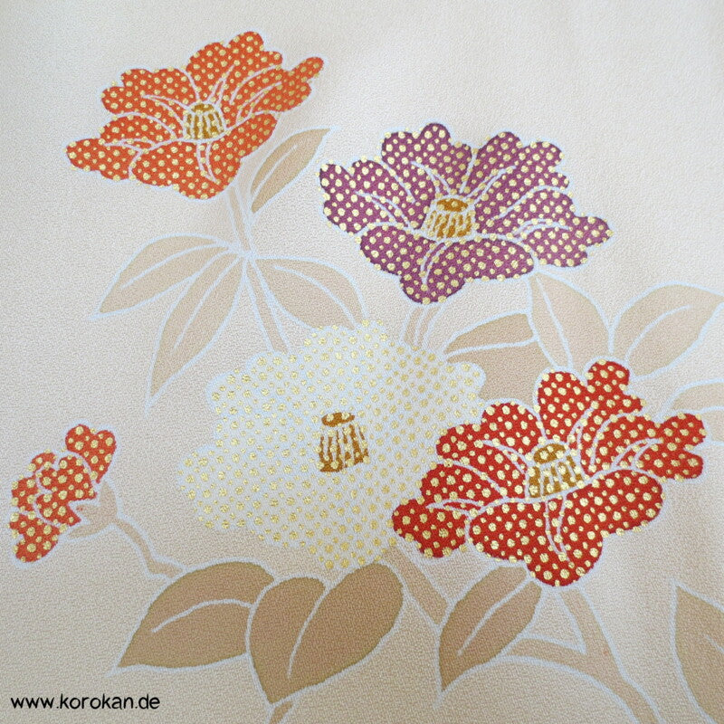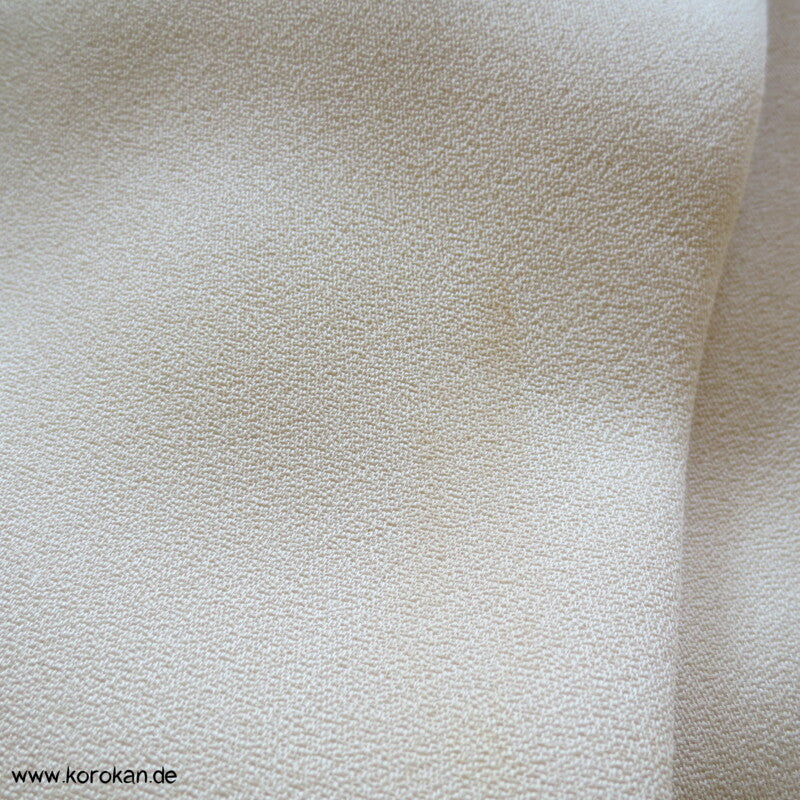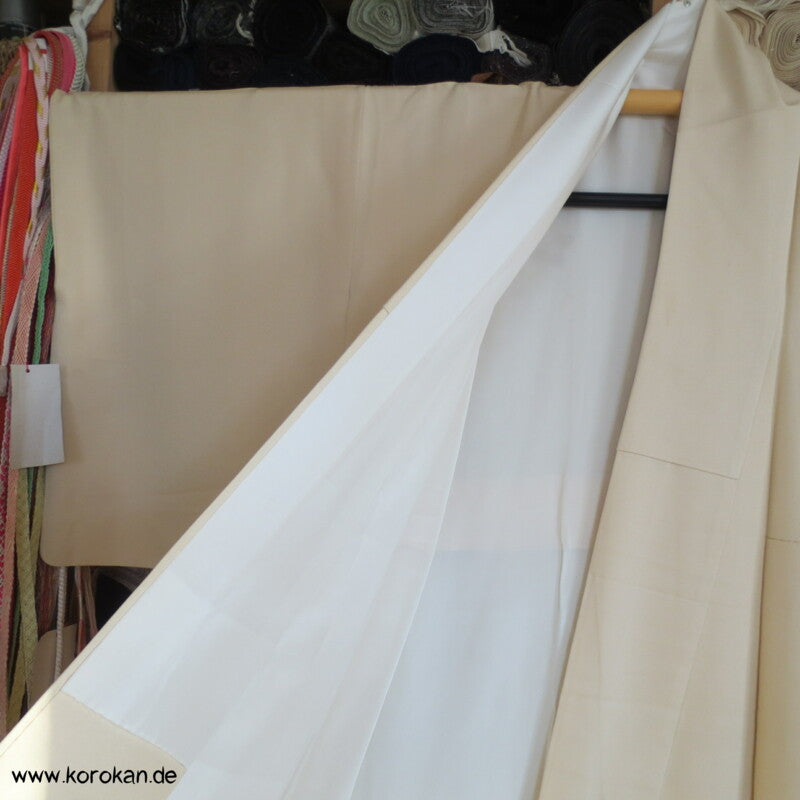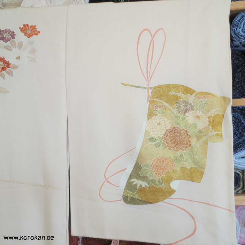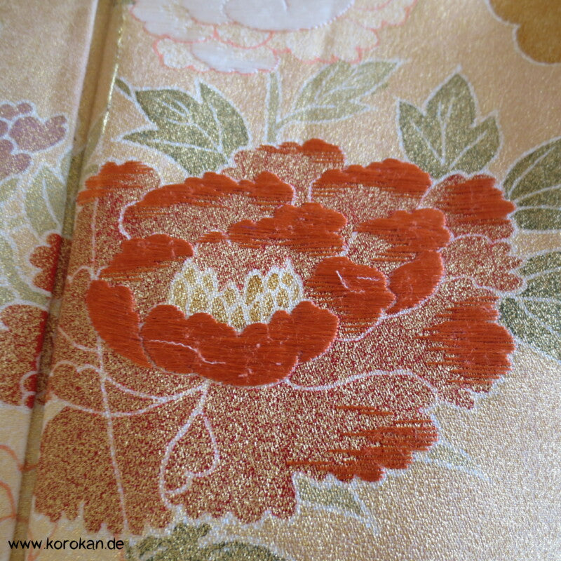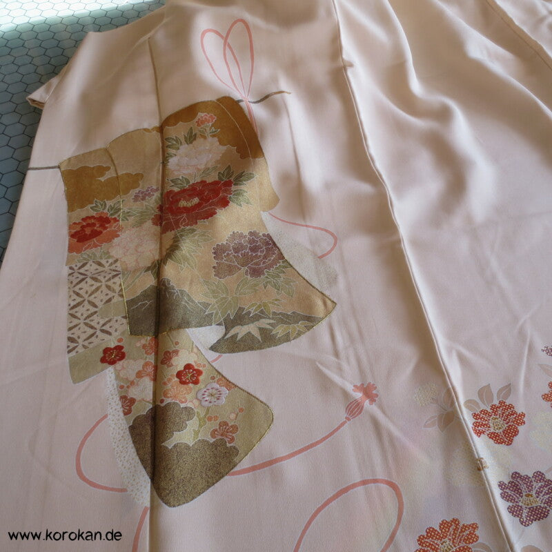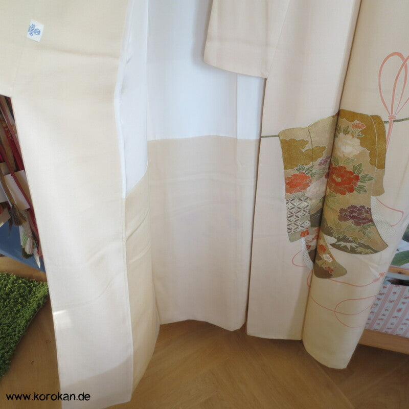 Vintage Homongi Kimono hautfarbener dicker Seidencrepesatin, bemalt mit Kimonovorhang / Kimonoständer, teilbestickt mit Gold und Goldauflage, feinem oberen hellen Seidenfutter und unterem Hakkake Seidenfutter im Obermaterial.