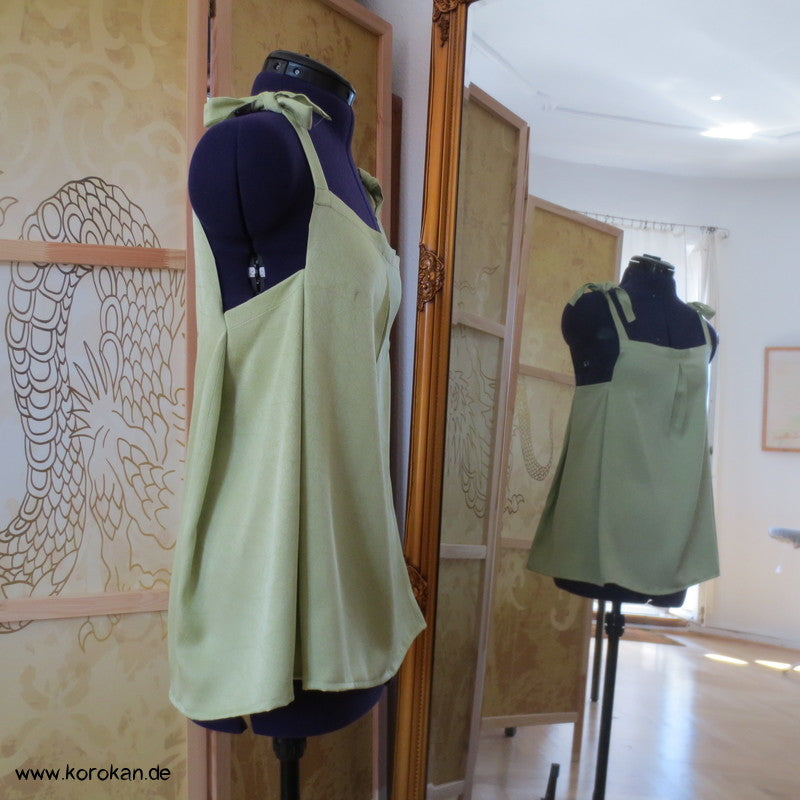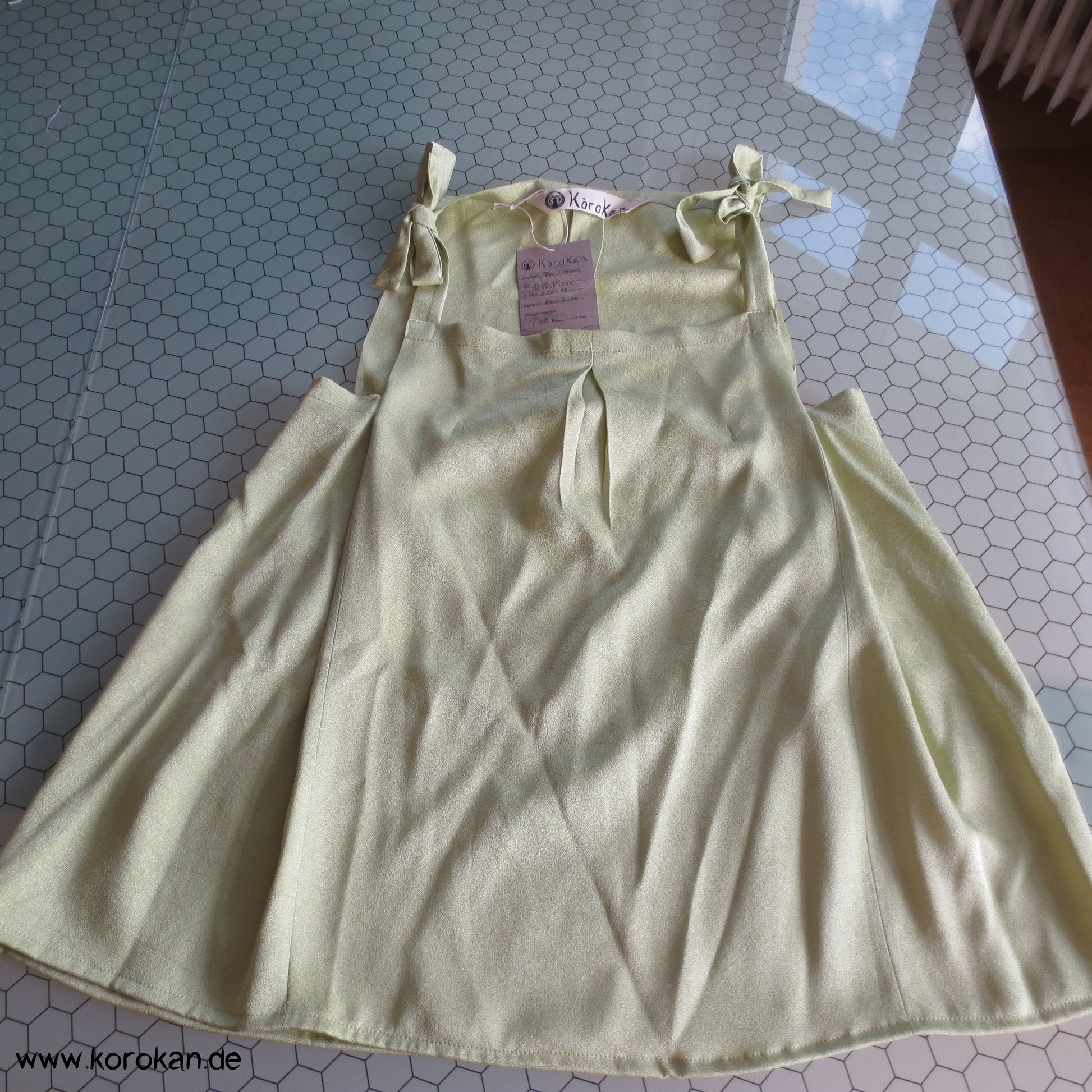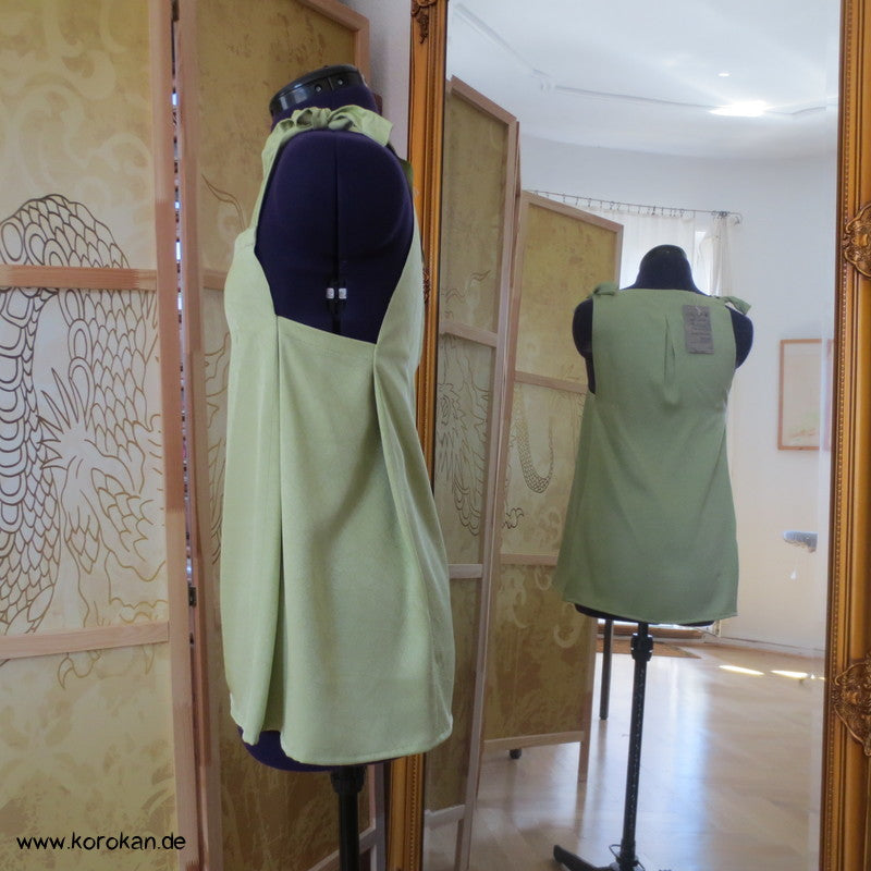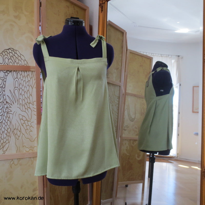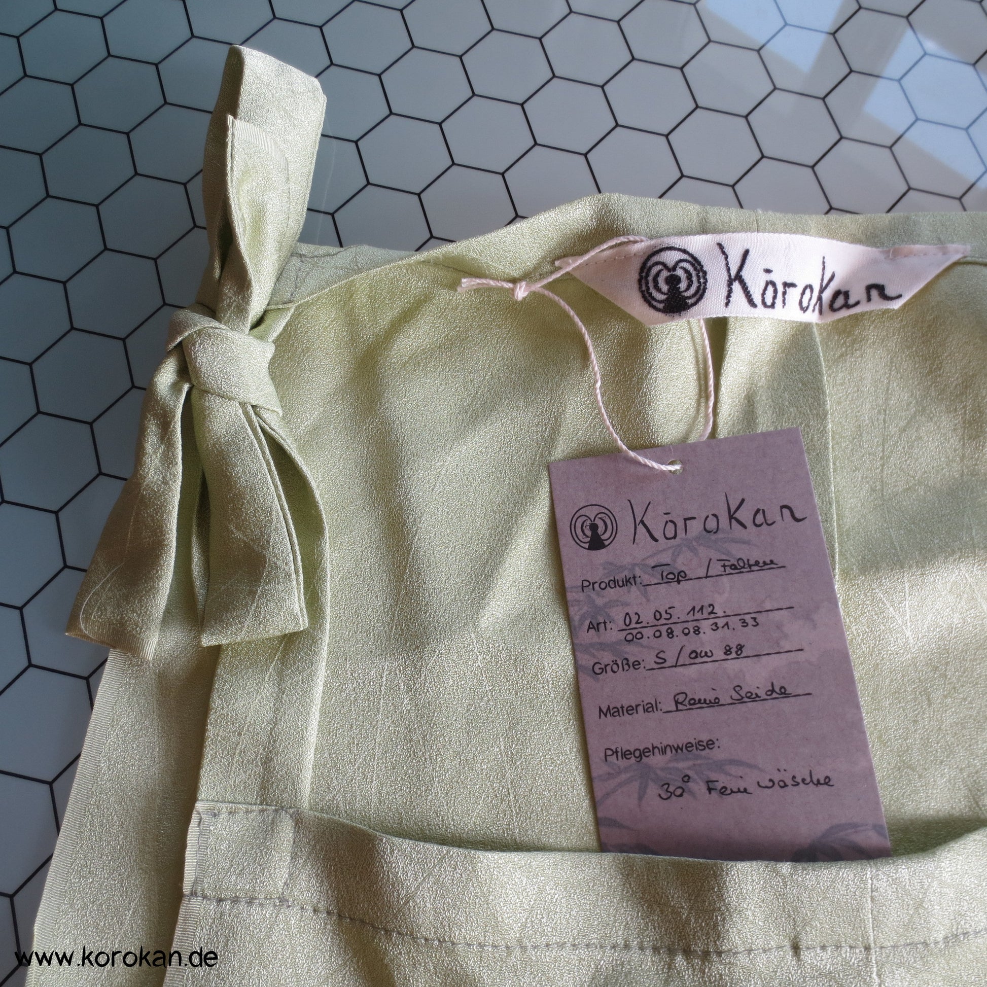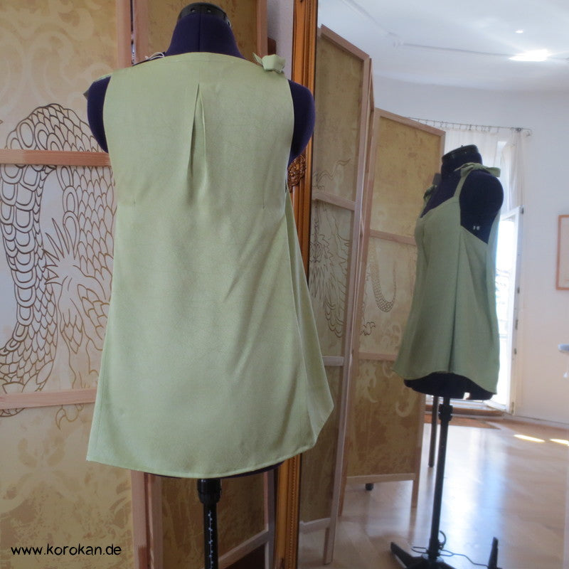 Kimono Seidendamast Top hellgrüne zart melierte Seide, Rechteckig Kanten, Zero Waste mit Bindebandträger, die sich gut auf die individuell gewünschte Länge einstellen lassen