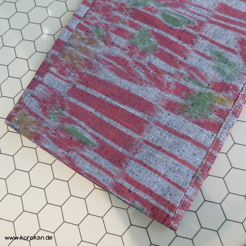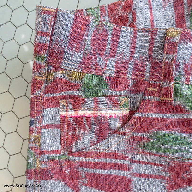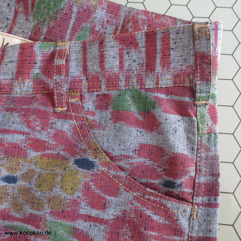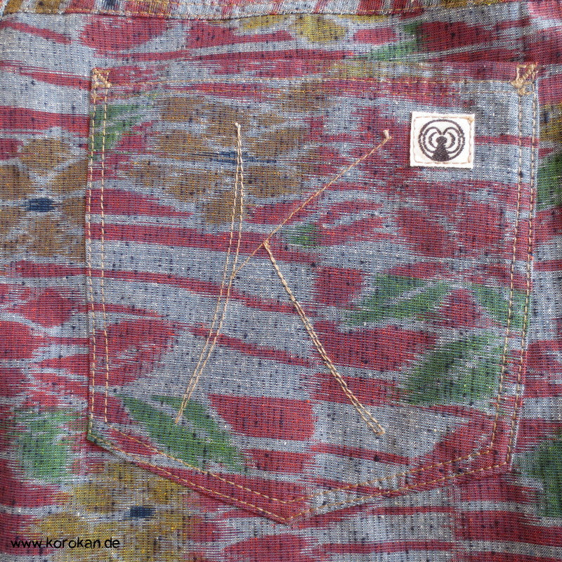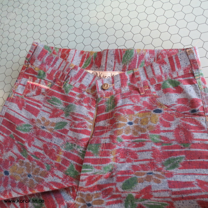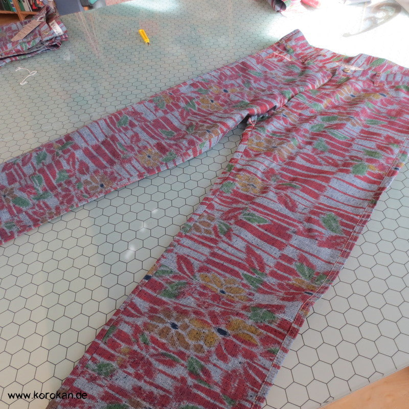 Jeans nach einem Standard Schnitt W32 L32 aus einem japanischen Kimono dicken Tsumugi Seide Stoff mit Kasuri bunten Blüten auf graublau, ungefüttert, Reissverschluss, Metallknopf, Gürtelschnallen, aufgesetzten Taschen hinten