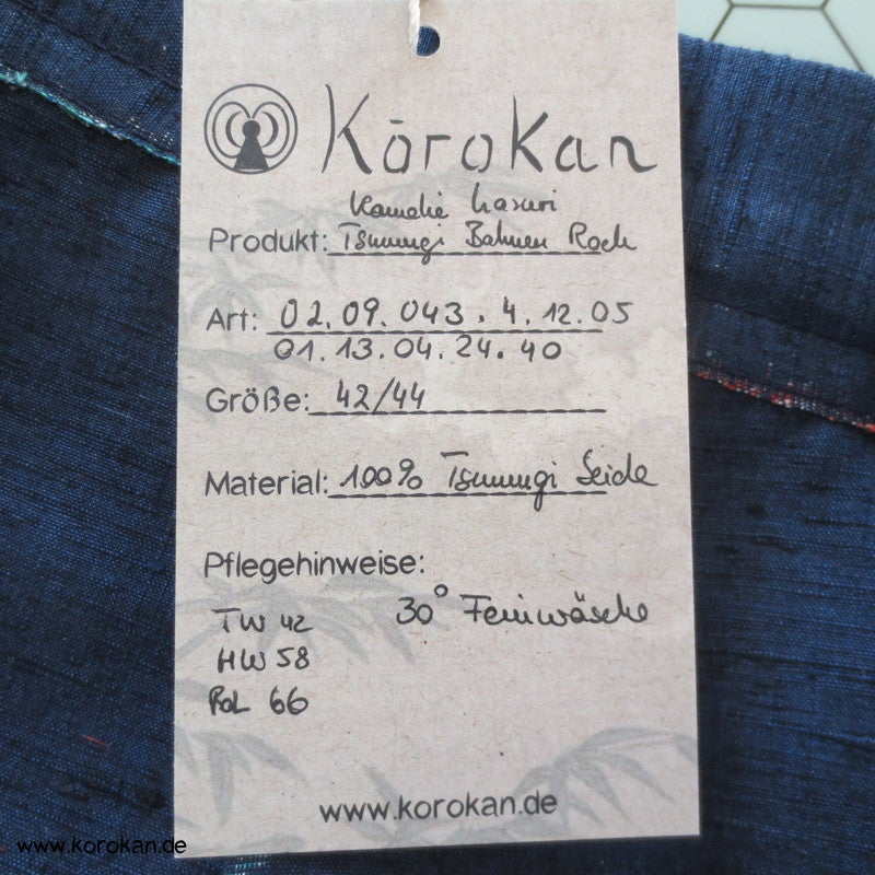 6 Bahnen Rock aus Kimono Tsumugi Seiden Stoff, Kasuri Blüten in rot auf blau, Bahnen aufeinander genäht, ungefüttert, geschlossen auf Reissverschluss und Knopf
