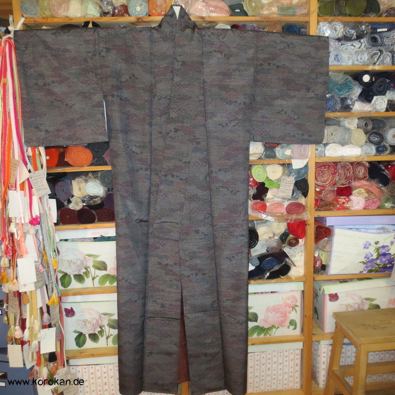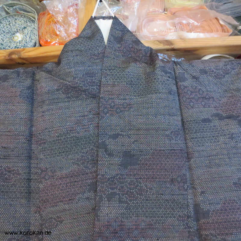 Vintage Tsumugi Seiden Komon Kimono Kasuri Kiribame mit Motiven, oberes Futter hell, unteres Hakkake Futter in brauner Seide