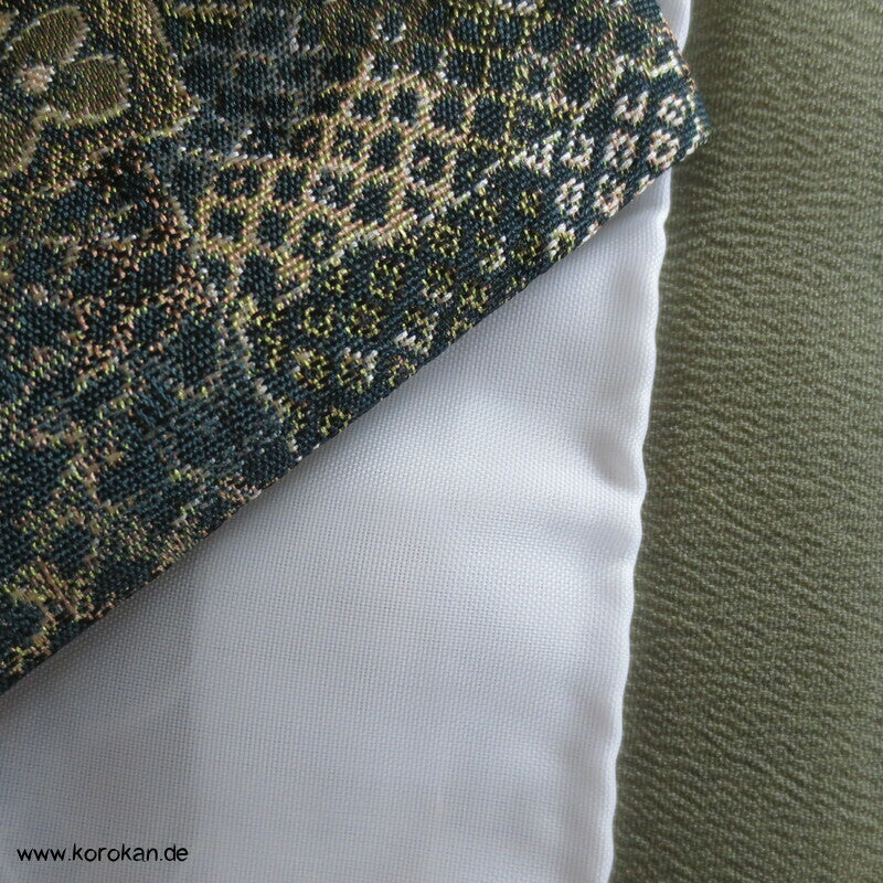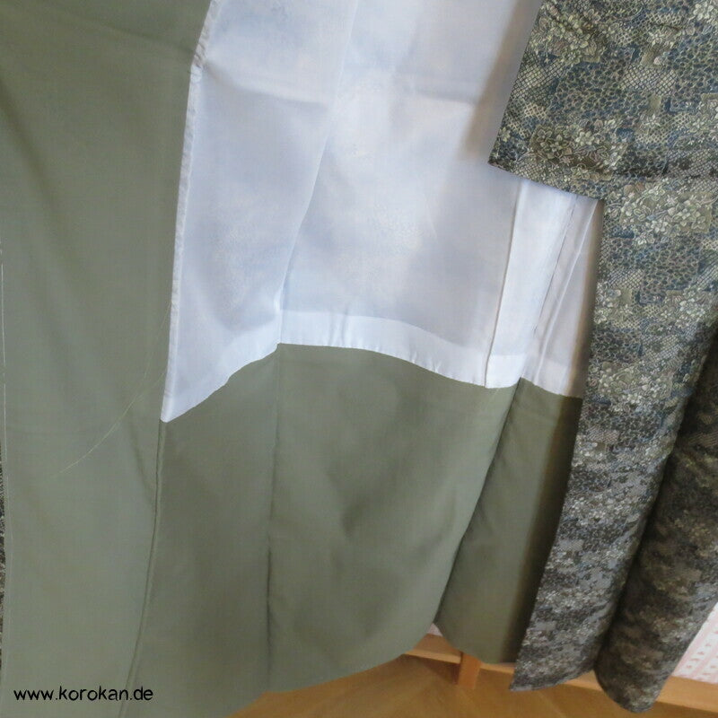 Vintage Komon Kimono sehr fein gewebter Jacquard, Seide oder Seidenmischung, eventuell mit etwas Wolle mit feinsten kleinen Mustern in Kiribame Steinplattenmuster angeordnet, oberem hellen Futter und unterem Hakkake Futter in graugrün