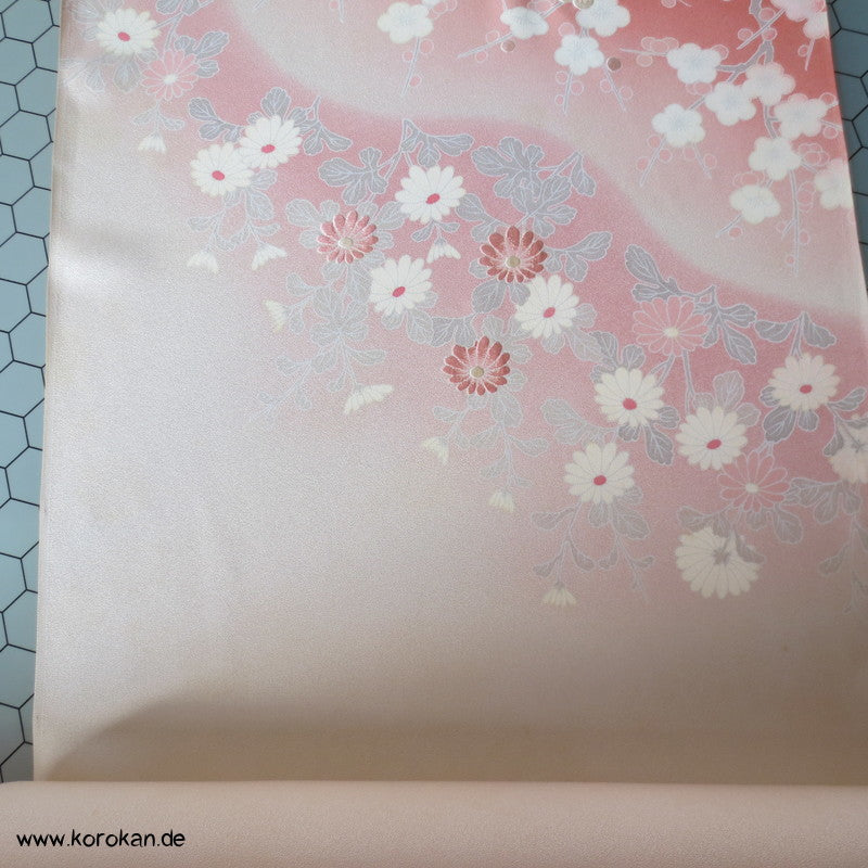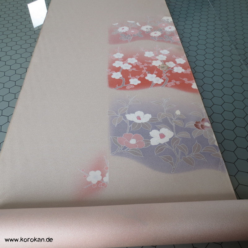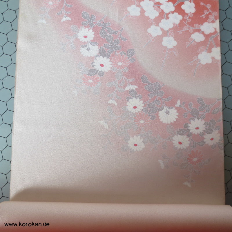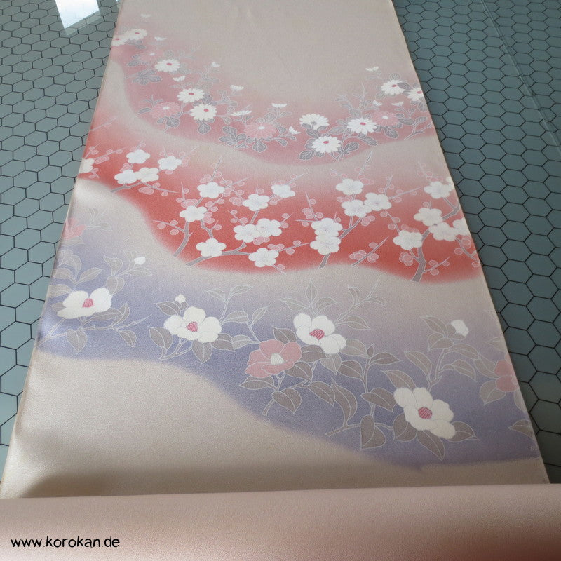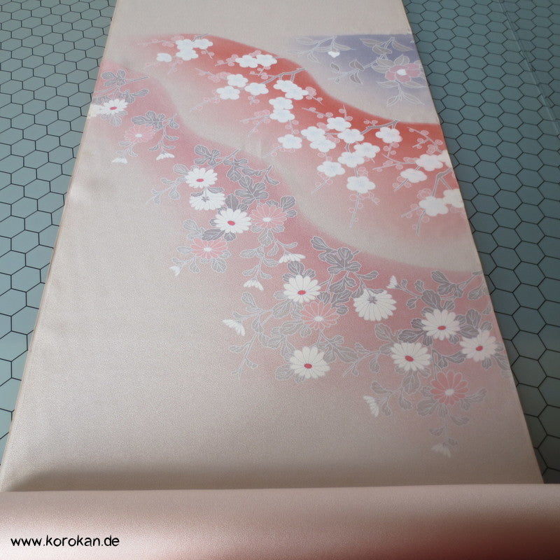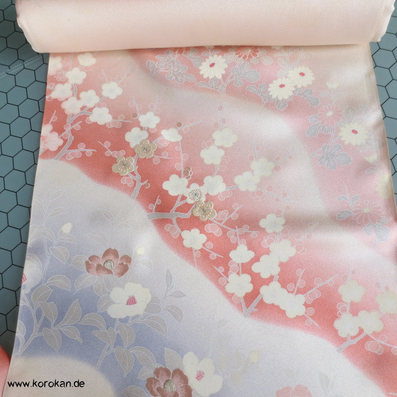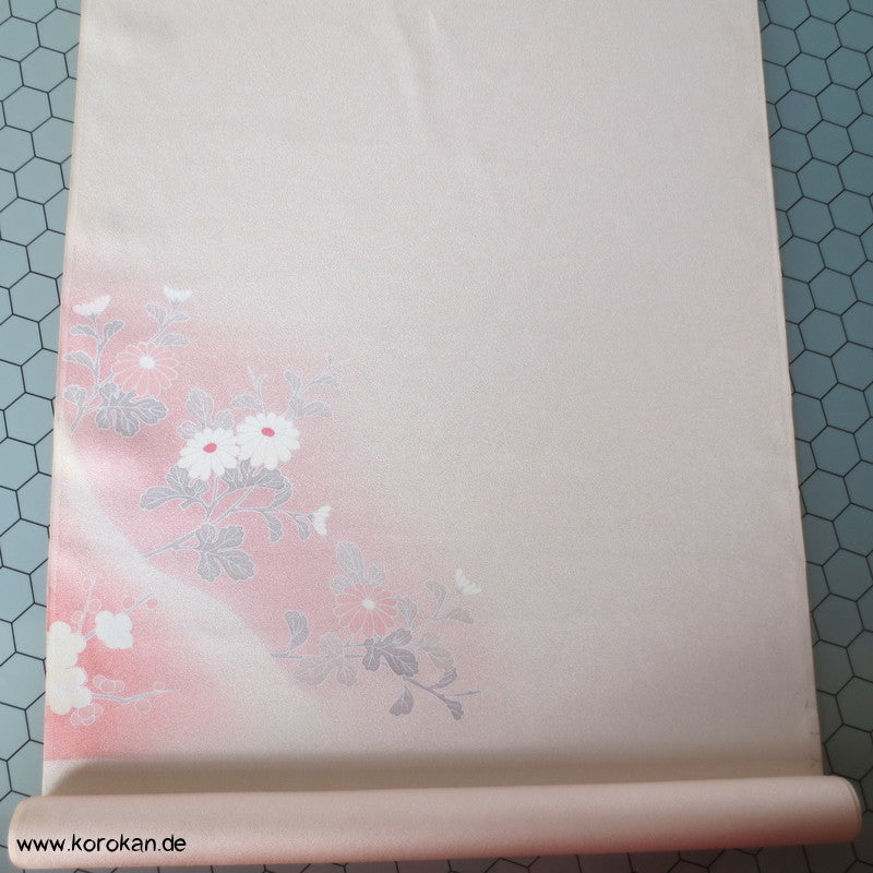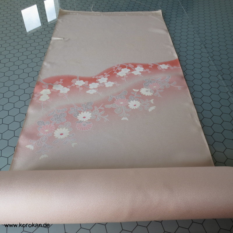Vintage unbenutzter japanischer Stoffballen Crepe Seide, bemalt mit verschiedenen Blüten, teilbestickt für einen ganzen Homongi Kimono. Das Muster ist unregelmäßig im Stoff verteilt und wird erst durch das genaue Zusammensetzen der Bahnen ein ganzes Bild.