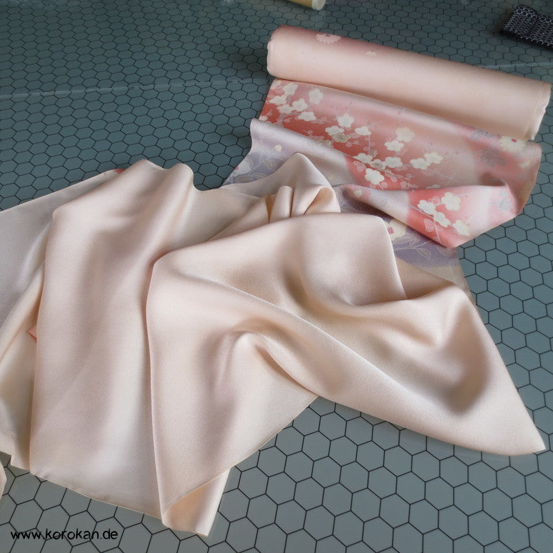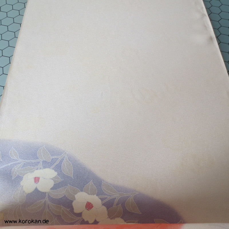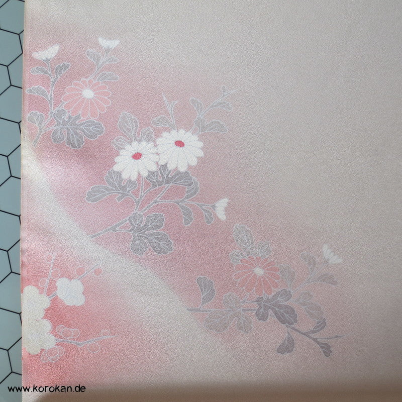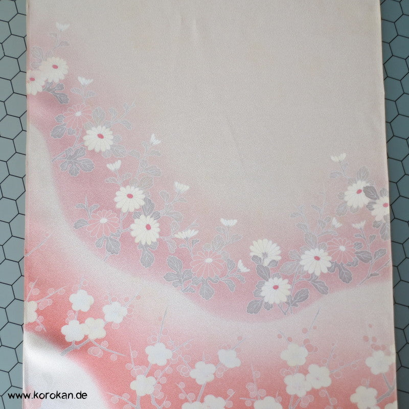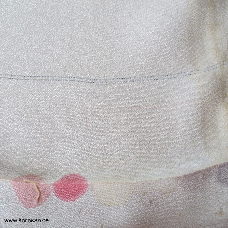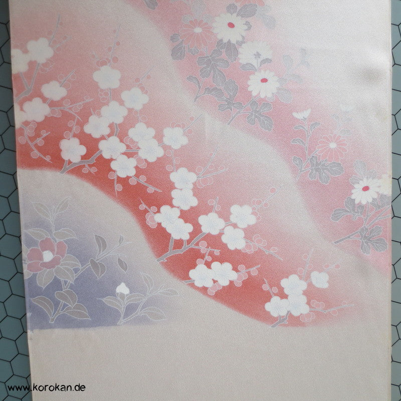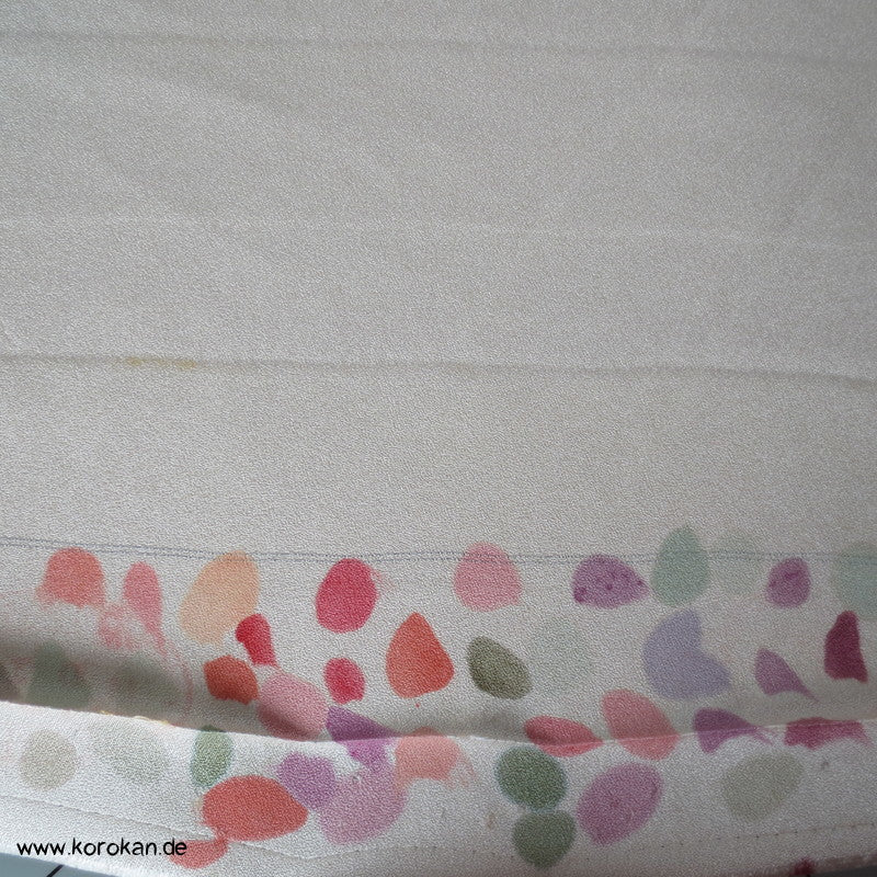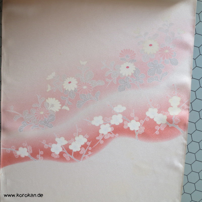 Vintage unbenutzter japanischer Stoffballen Crepe Seide, bemalt mit verschiedenen Blüten, teilbestickt für einen ganzen Homongi Kimono. Das Muster ist unregelmäßig im Stoff verteilt und wird erst durch das genaue Zusammensetzen der Bahnen ein ganzes Bild.