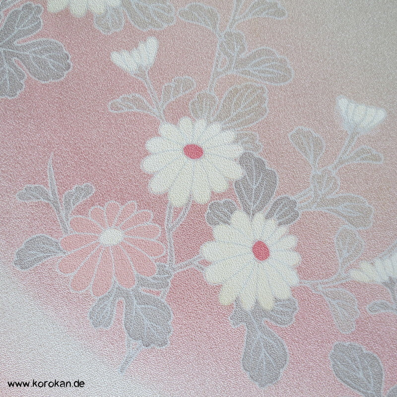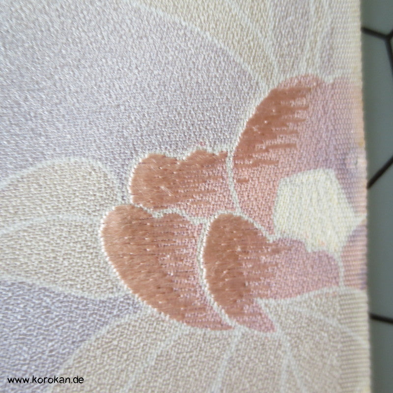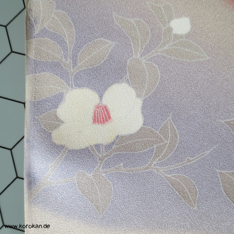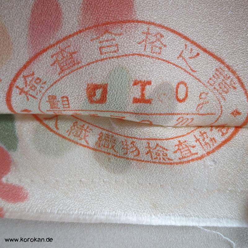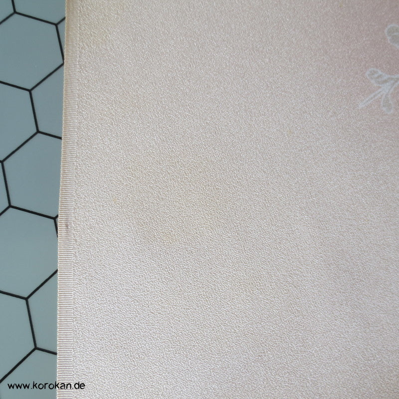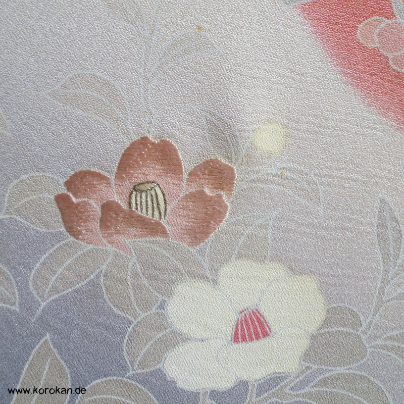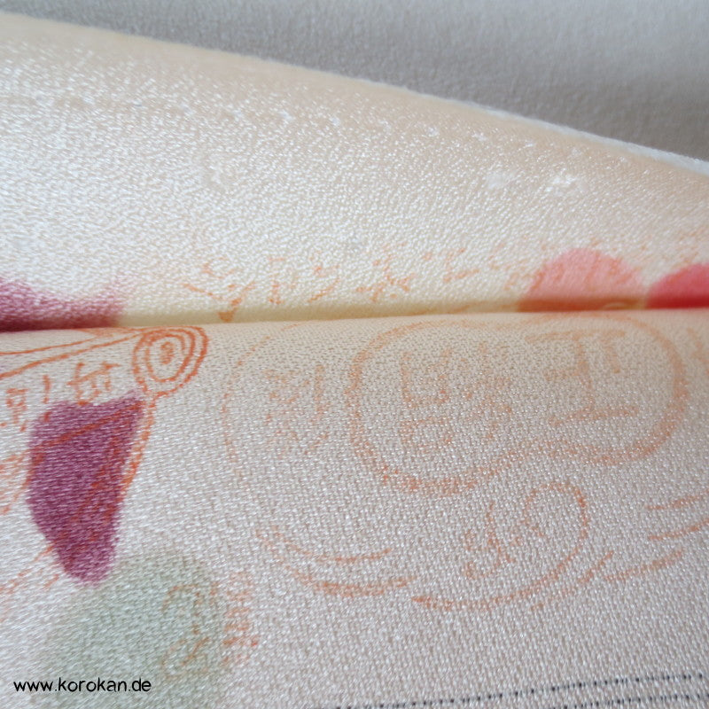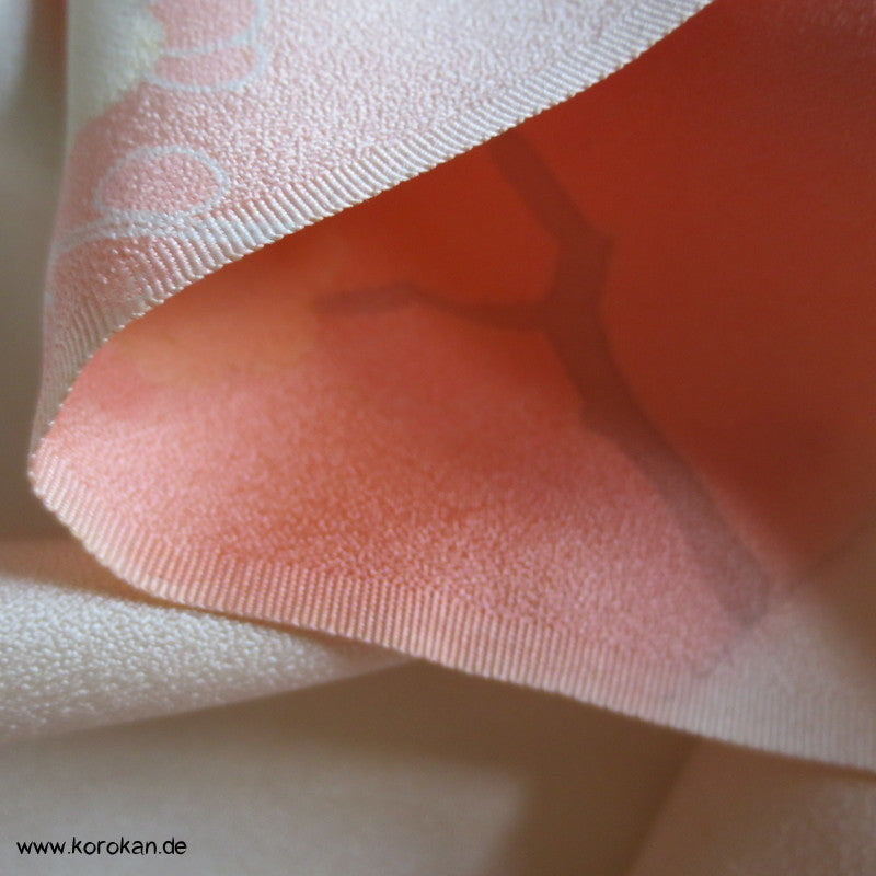 Vintage unbenutzter japanischer Stoffballen Crepe Seide, bemalt mit verschiedenen Blüten, teilbestickt für einen ganzen Homongi Kimono. Das Muster ist unregelmäßig im Stoff verteilt und wird erst durch das genaue Zusammensetzen der Bahnen ein ganzes Bild.