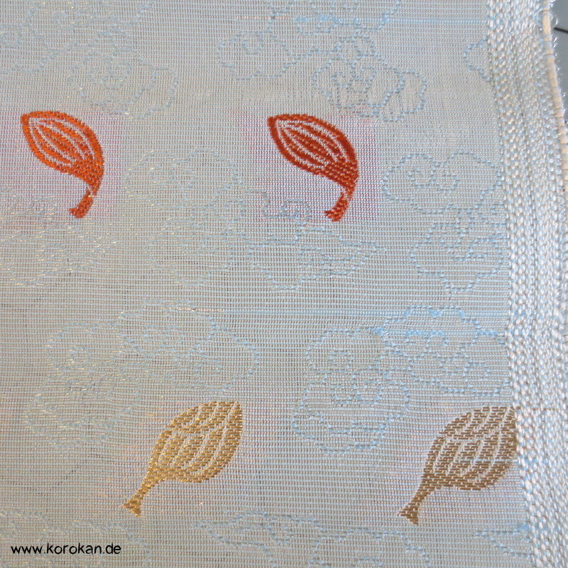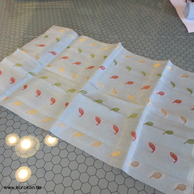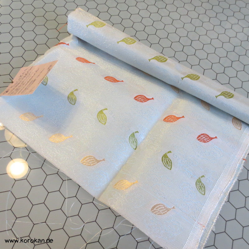 Vintage unbenutzer Seiden Brokat Rest bunte Blätter auf heller blassblauer halbtransparenter Basis, wohl eher für Tempelzwecke als für Bekleidungszwecke gewebt