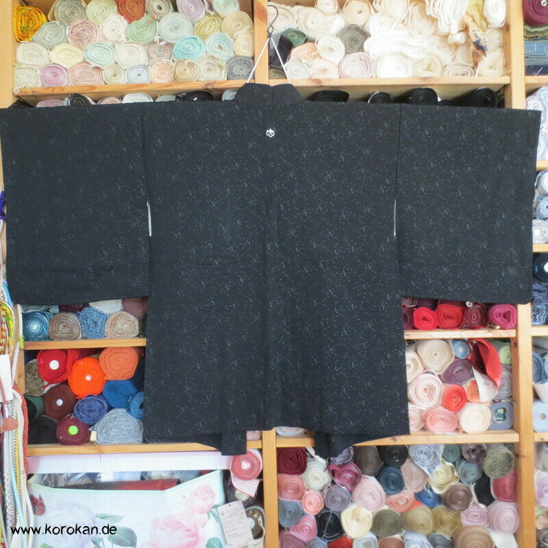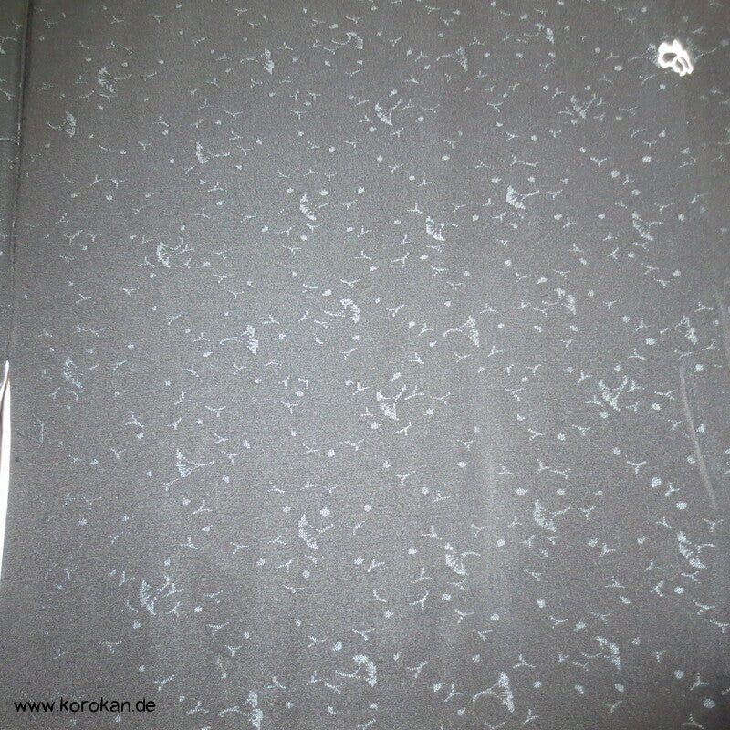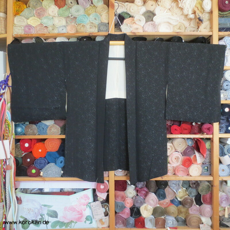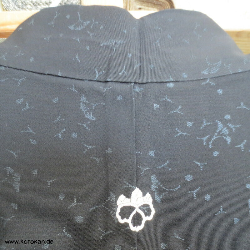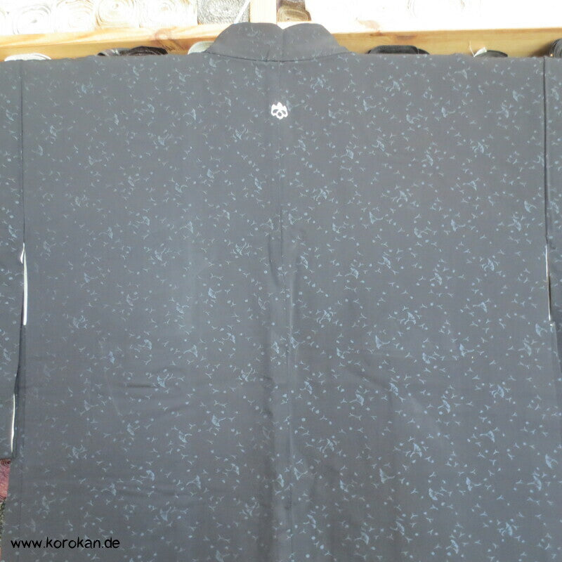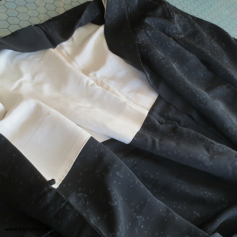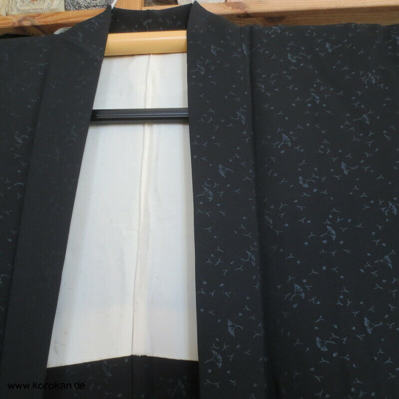 Vintage Haori Kimono Jacke aus feiner, schwarzer japanischer Crepe Seidenbrokat mit eingewebten blausilber Gingkoblättern und einem hellen oberen Damast Seidendamastfutter auch mit kleinen Gingkoblättern