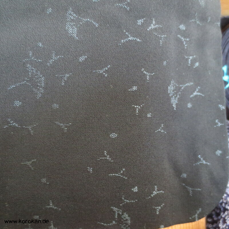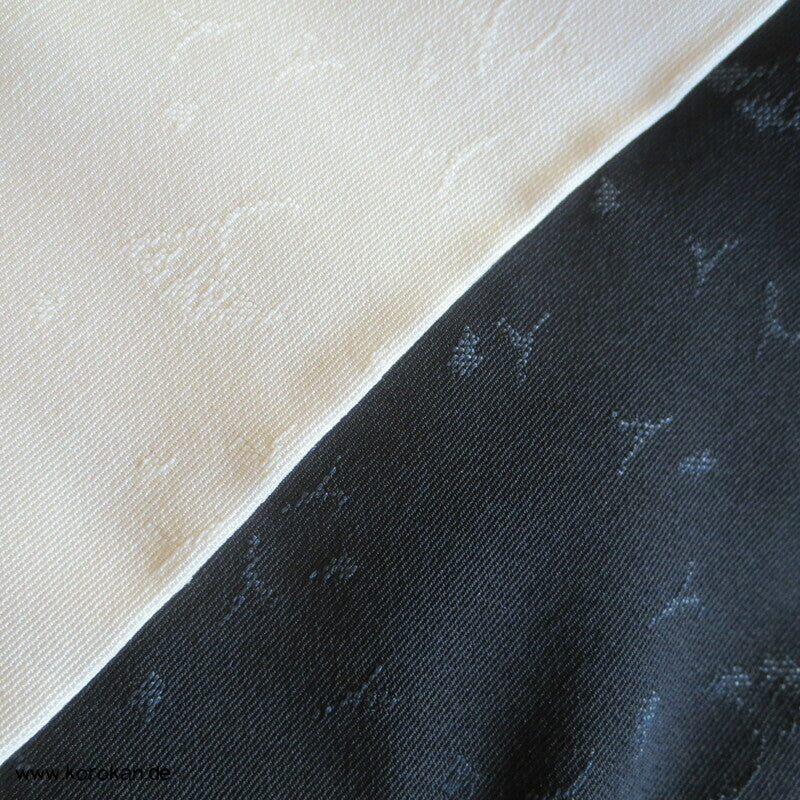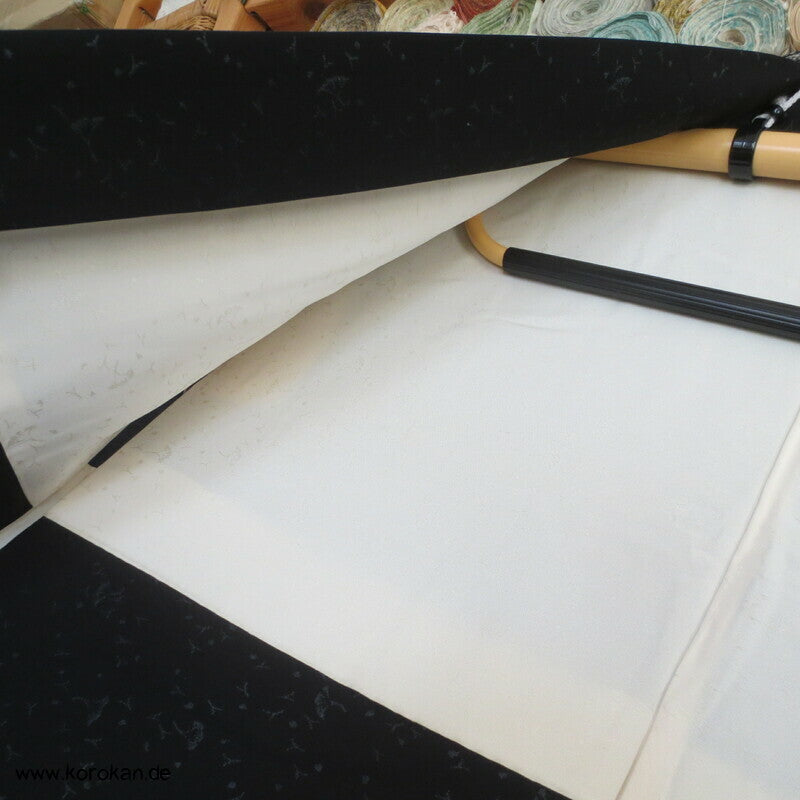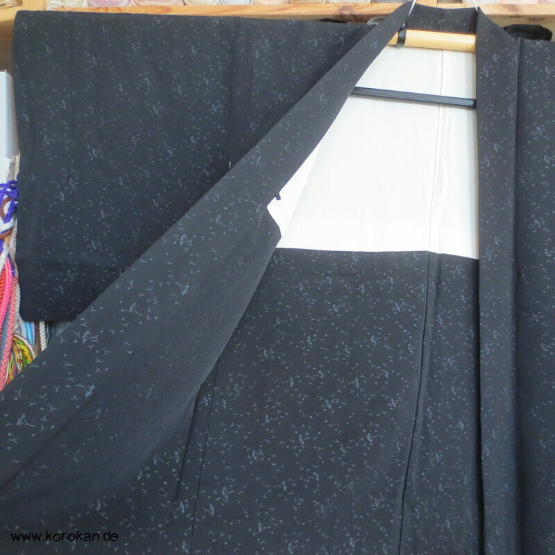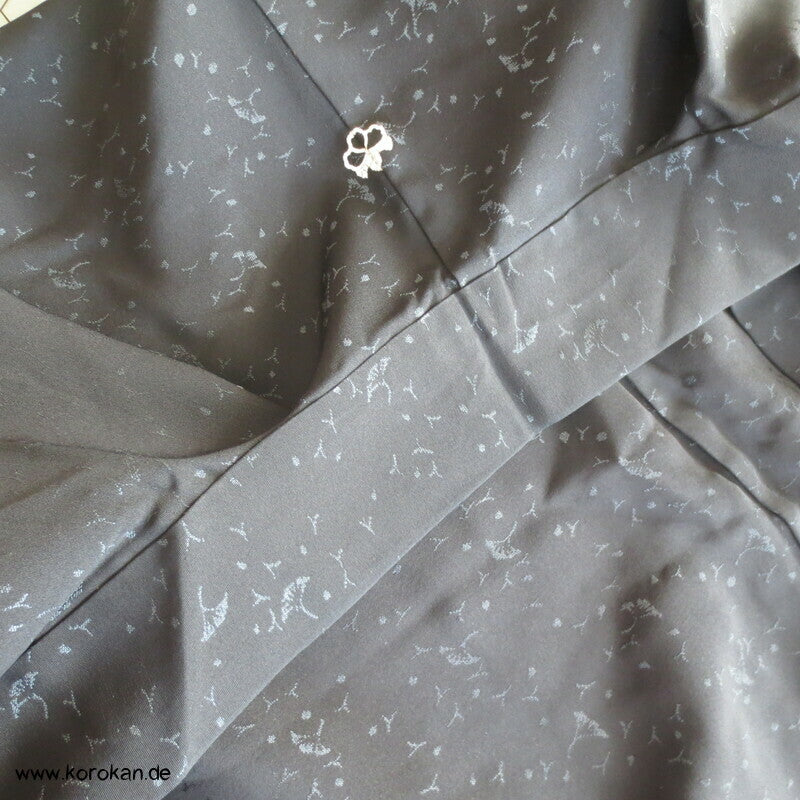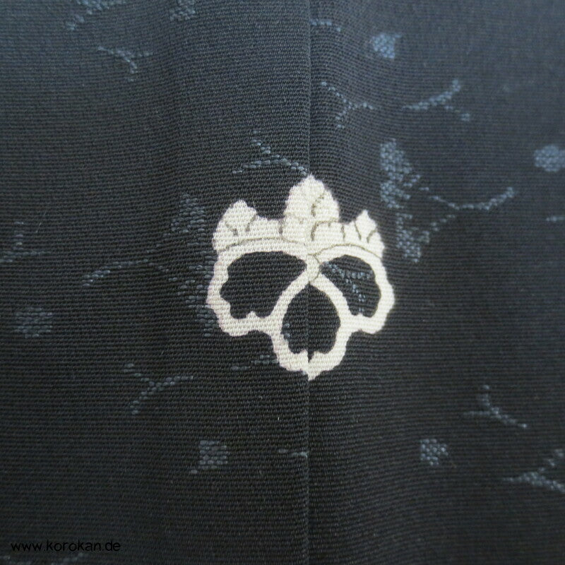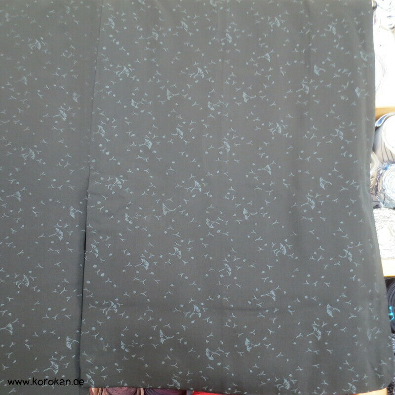 Vintage Haori Kimono Jacke aus feiner, schwarzer japanischer Crepe Seidenbrokat mit eingewebten blausilber Gingkoblättern und einem hellen oberen Damast Seidendamastfutter auch mit kleinen Gingkoblättern