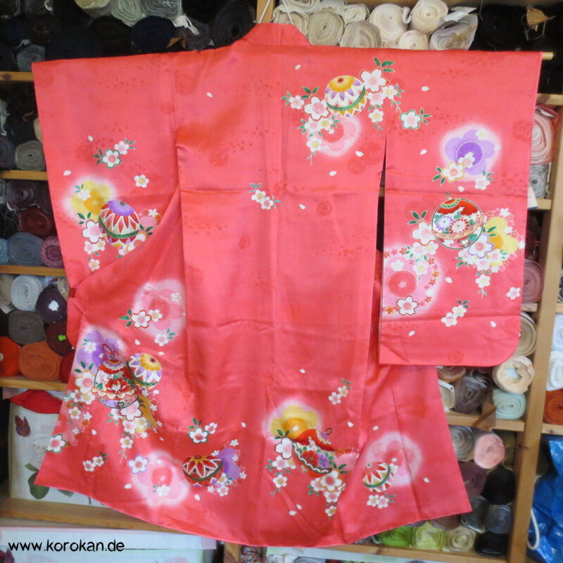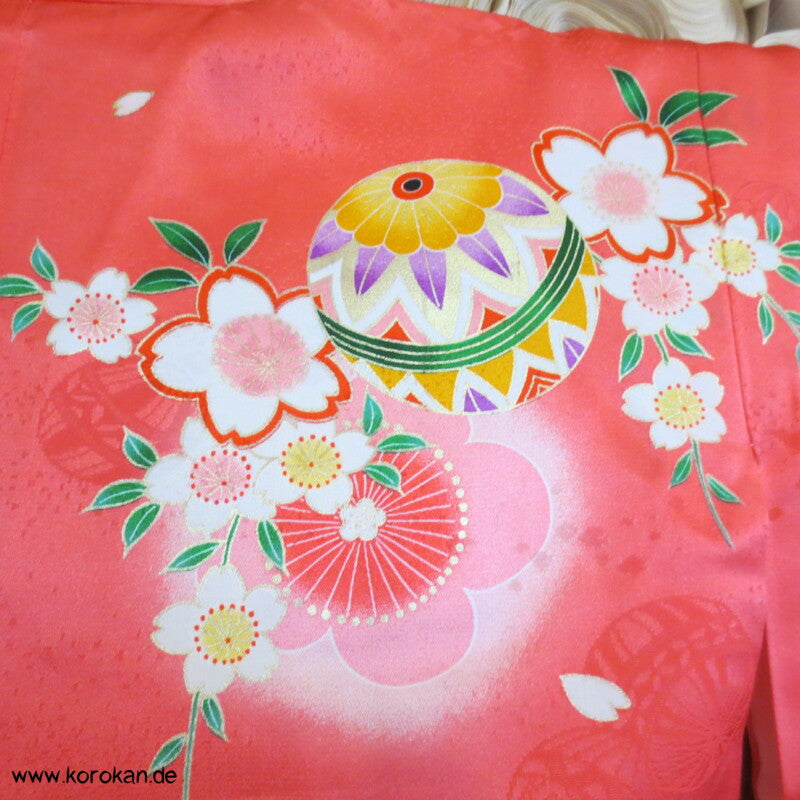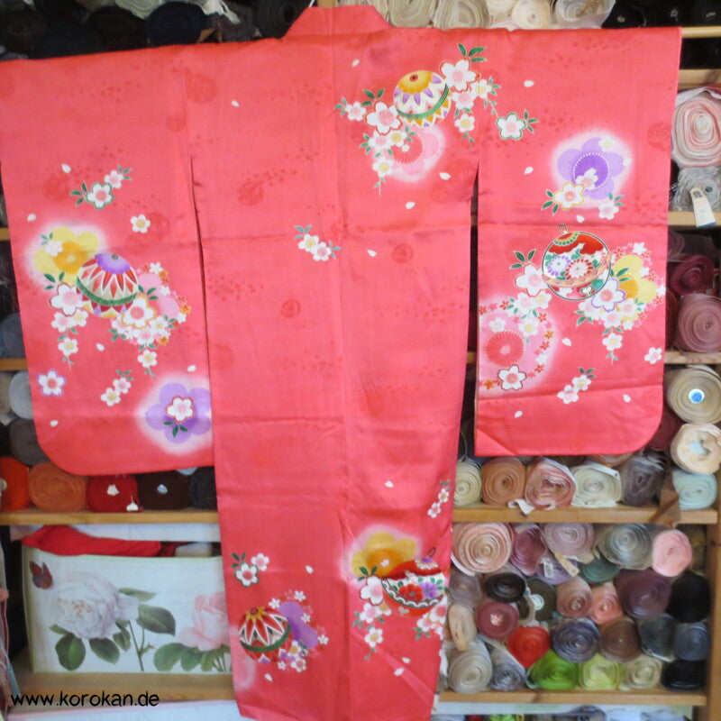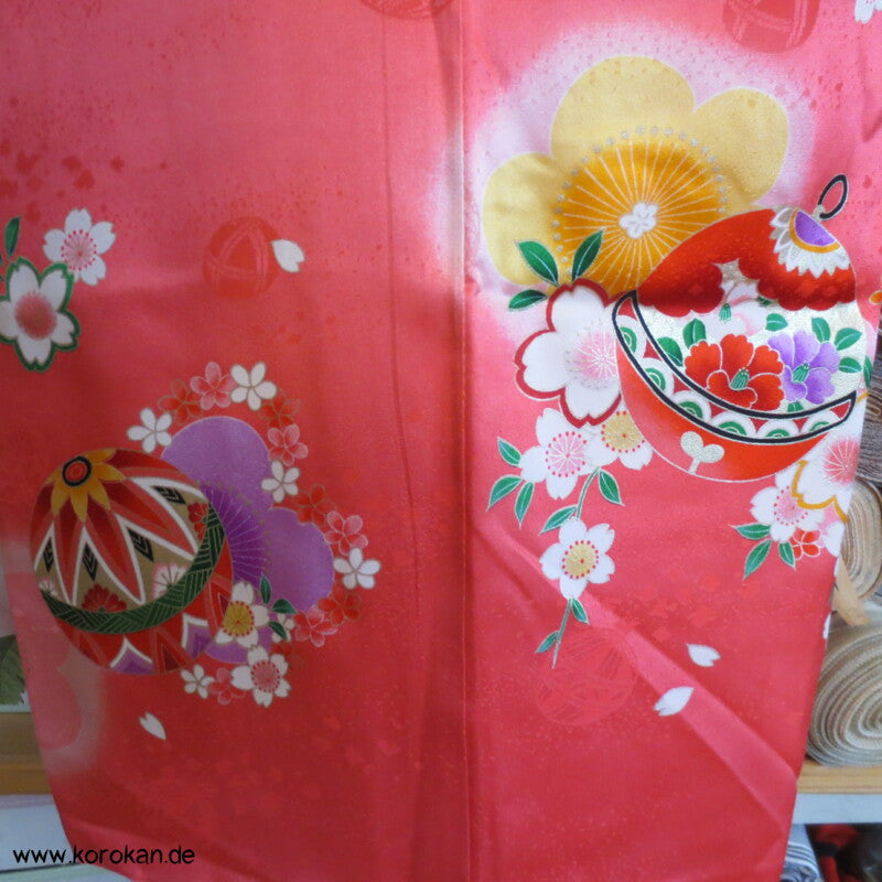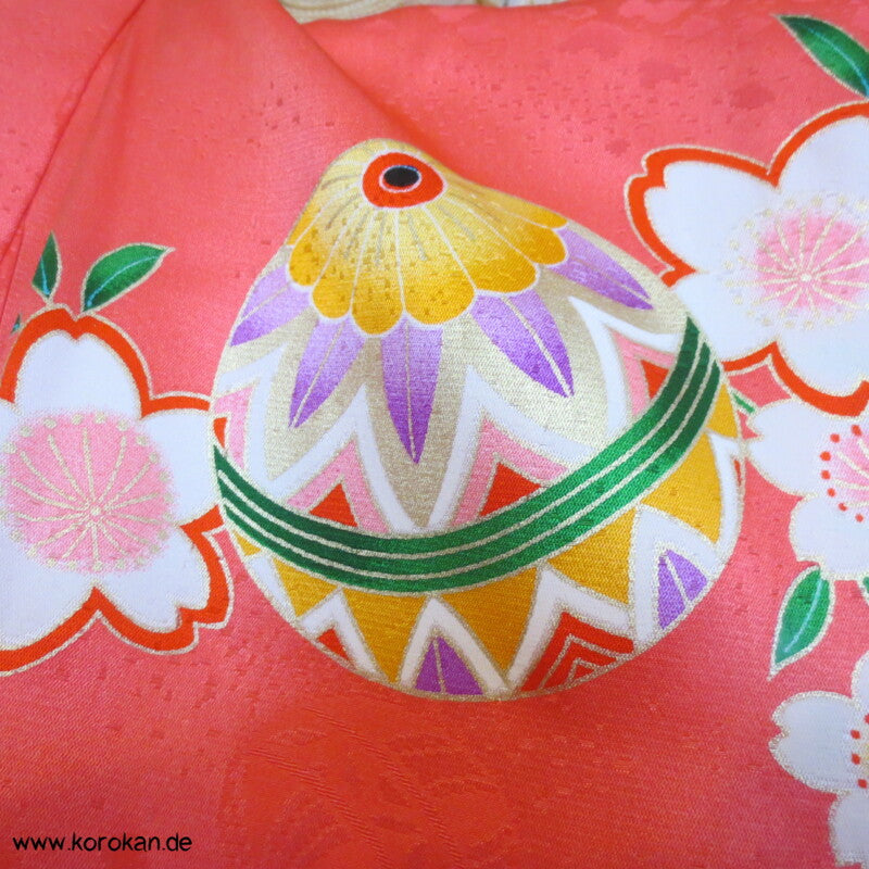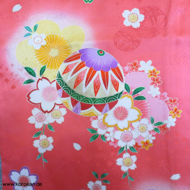 anischer Vintage Furisode Seidendamast für Mädchen, kleine Kinder Kimono bunt mit Temaribällen und Blüten etc...., mit Goldauflage