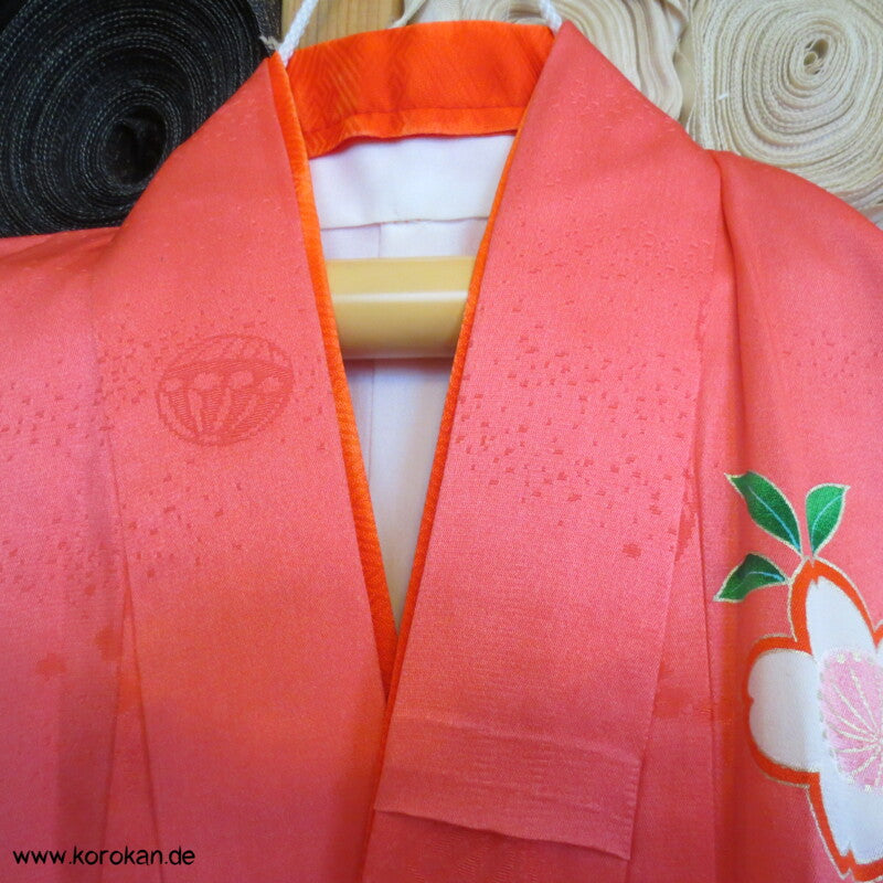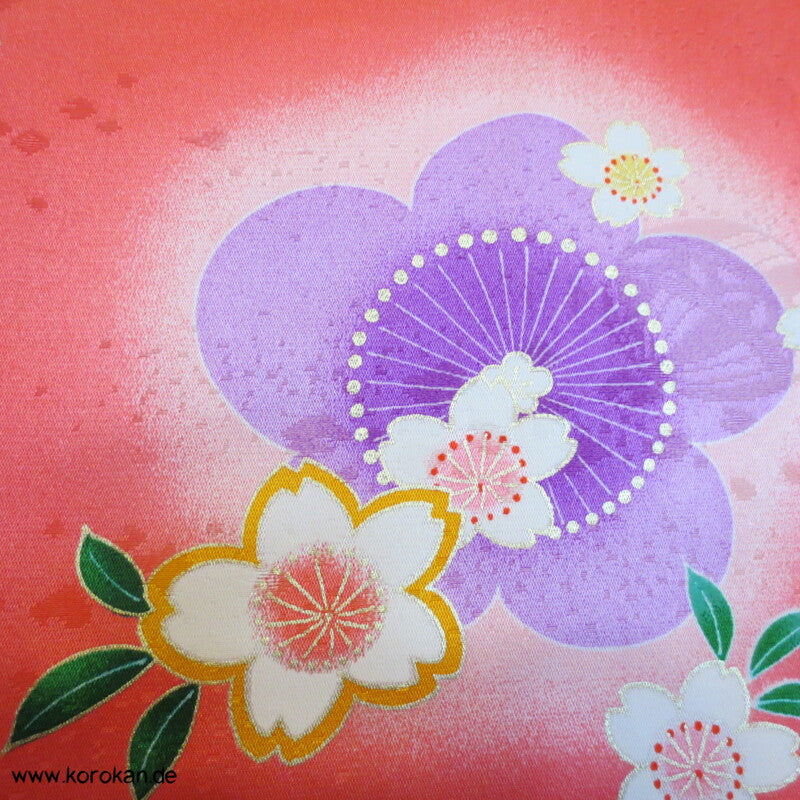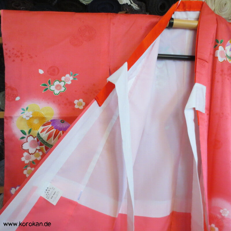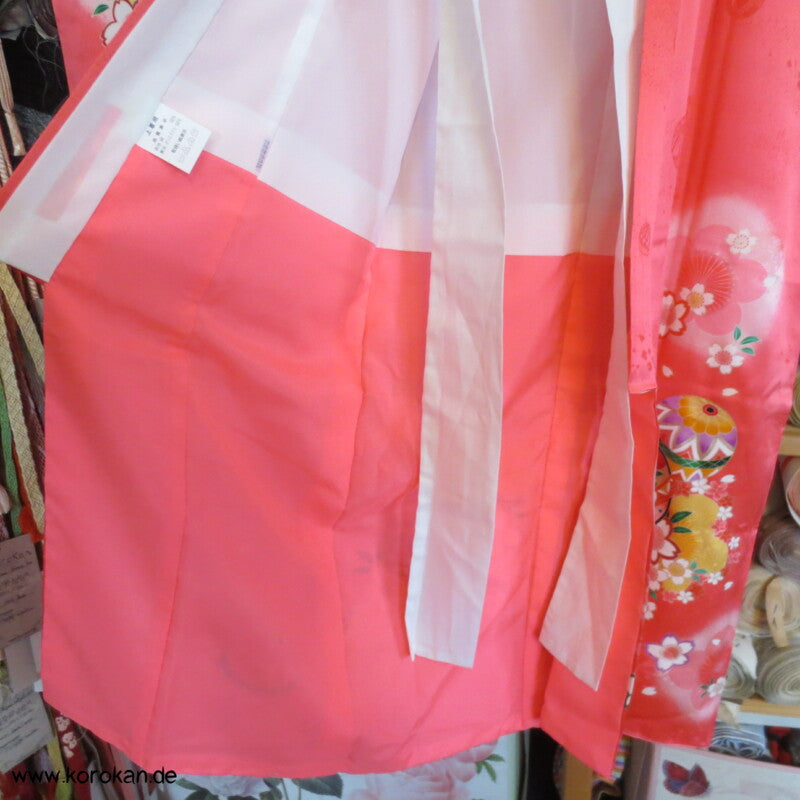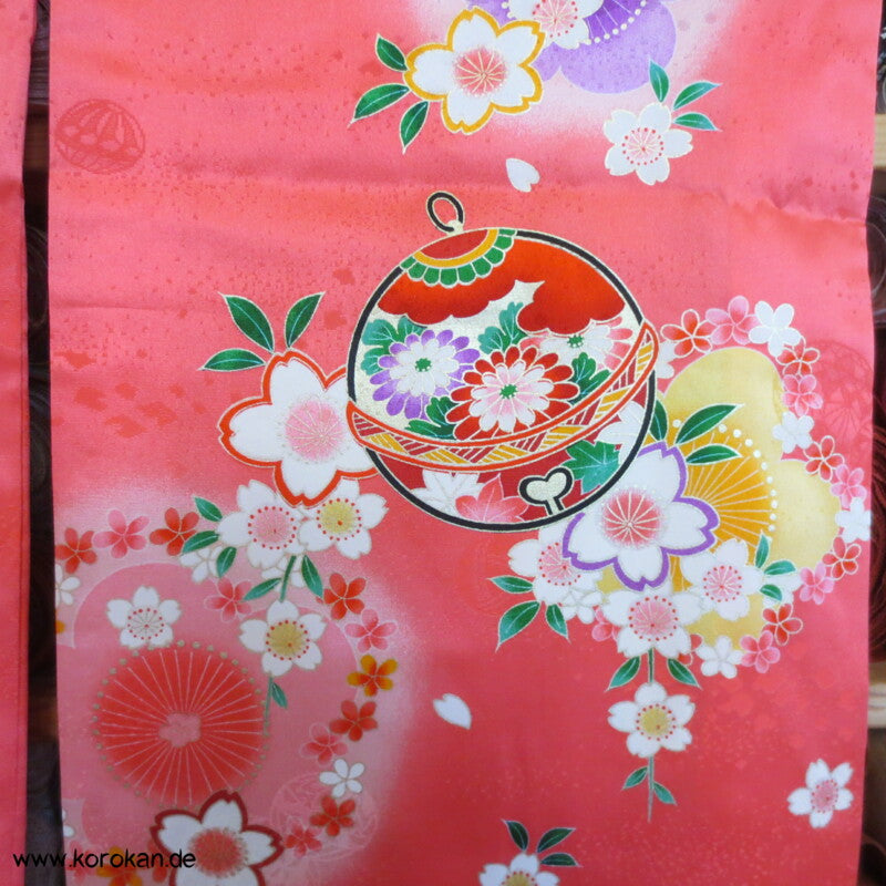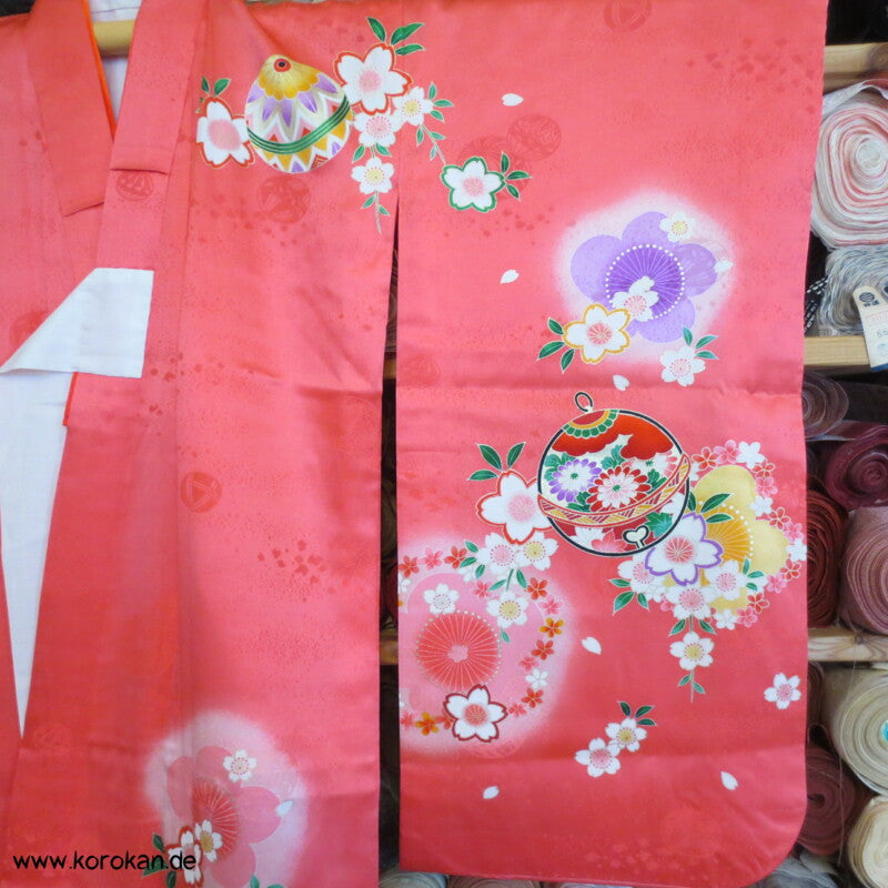 anischer Vintage Furisode Seidendamast für Mädchen, kleine Kinder Kimono bunt mit Temaribällen und Blüten etc...., mit Goldauflage