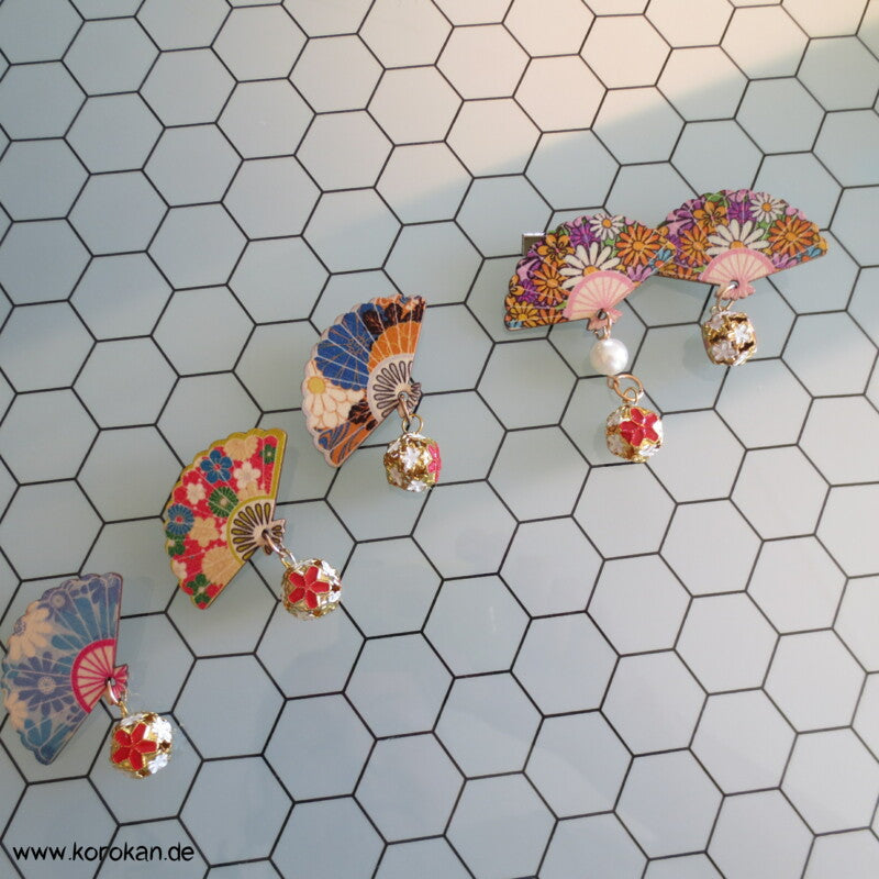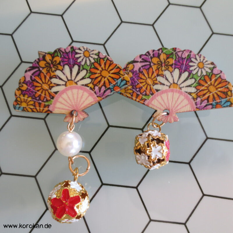Vintage unbenutzte kleine Holzfächer auf Klemmen mit anhängdenen Perlen für japanische Haartrachten.