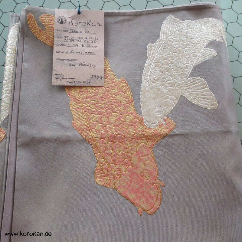 Koi Karpfen in gold, silber, kupfer Fukuro Obi Seidenbrokat Kimonogürtel
