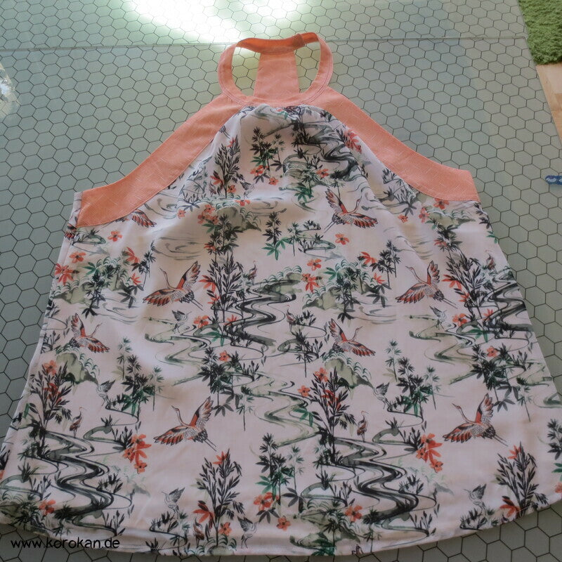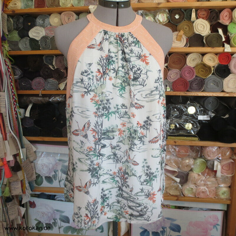 Neckholder Top mit abgesetztem Rand, voll gefüttert, mit Kranichdruck im Korpus und Higaki Flechmuster an den Kanten - ungewöhnlich, sehr japanisch vom Motiv, Vintage in sehr gutem Zustand