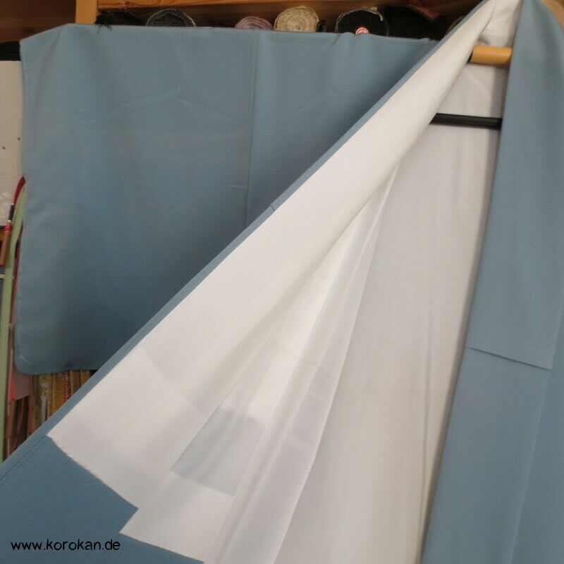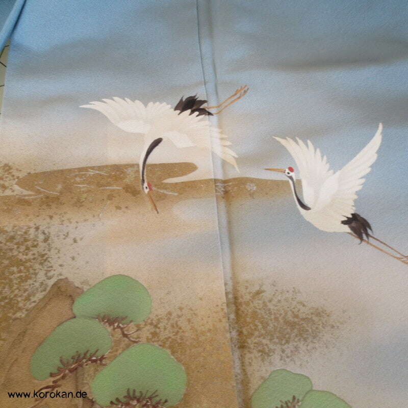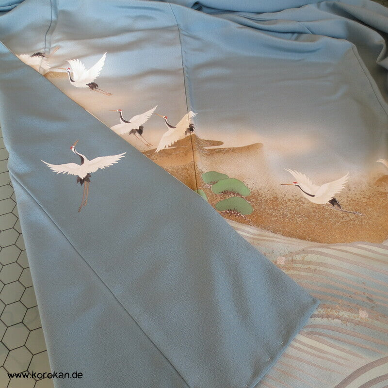 Vintage Irotomesode hellbleugrauer Seidencrepe handgemalte auffliegende Kraniche über dem Meer, moderne abstrakte Kiefern