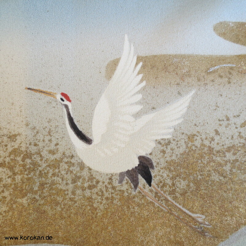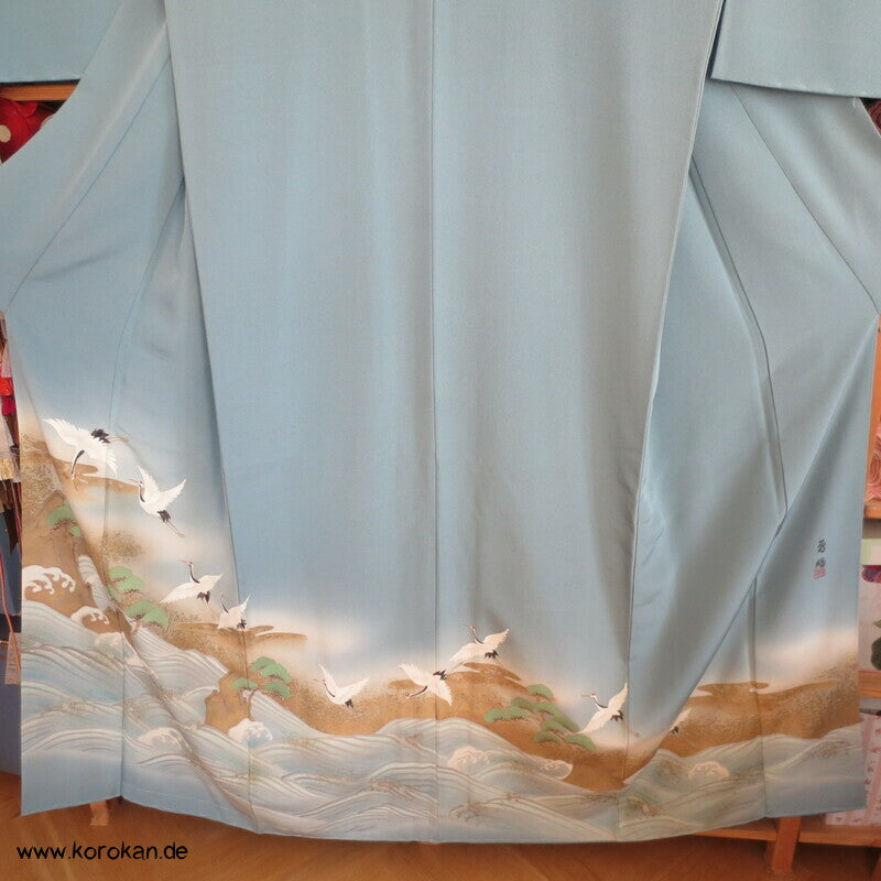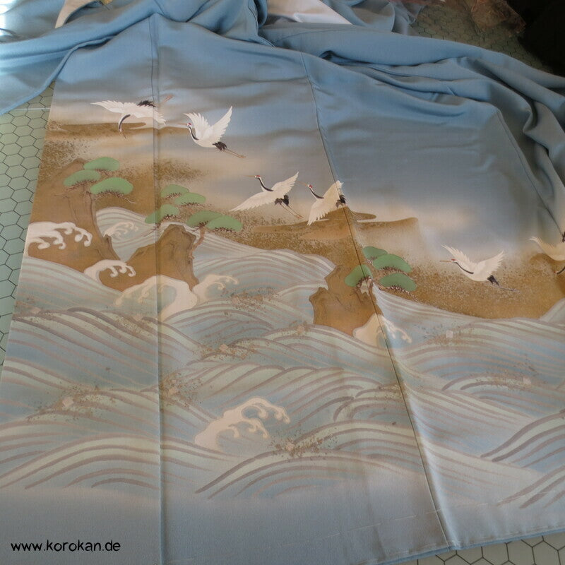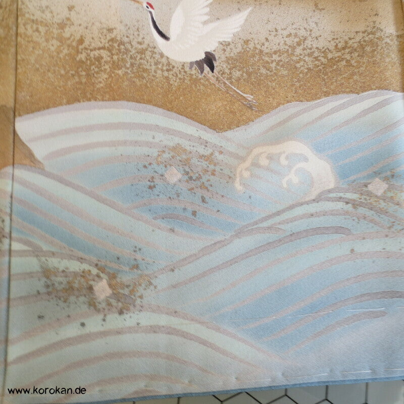 Kraniche über Wellen handbemalter Iro - Tomesode Kimono, japanischer Seidencrepe