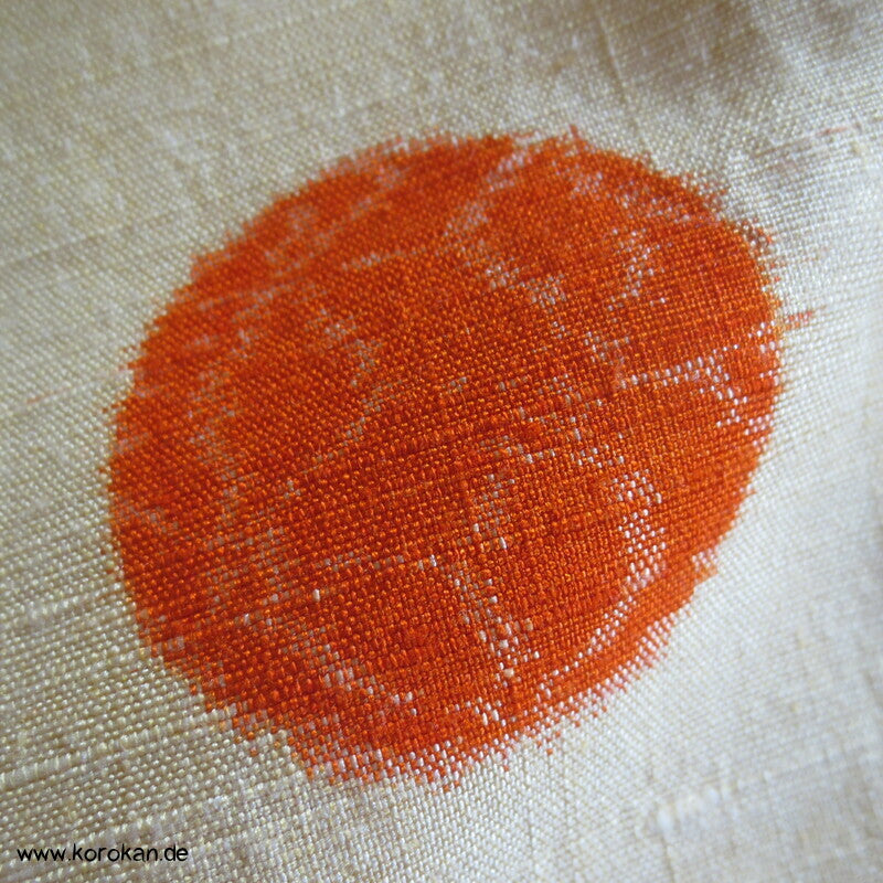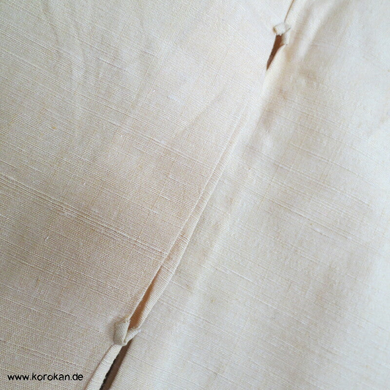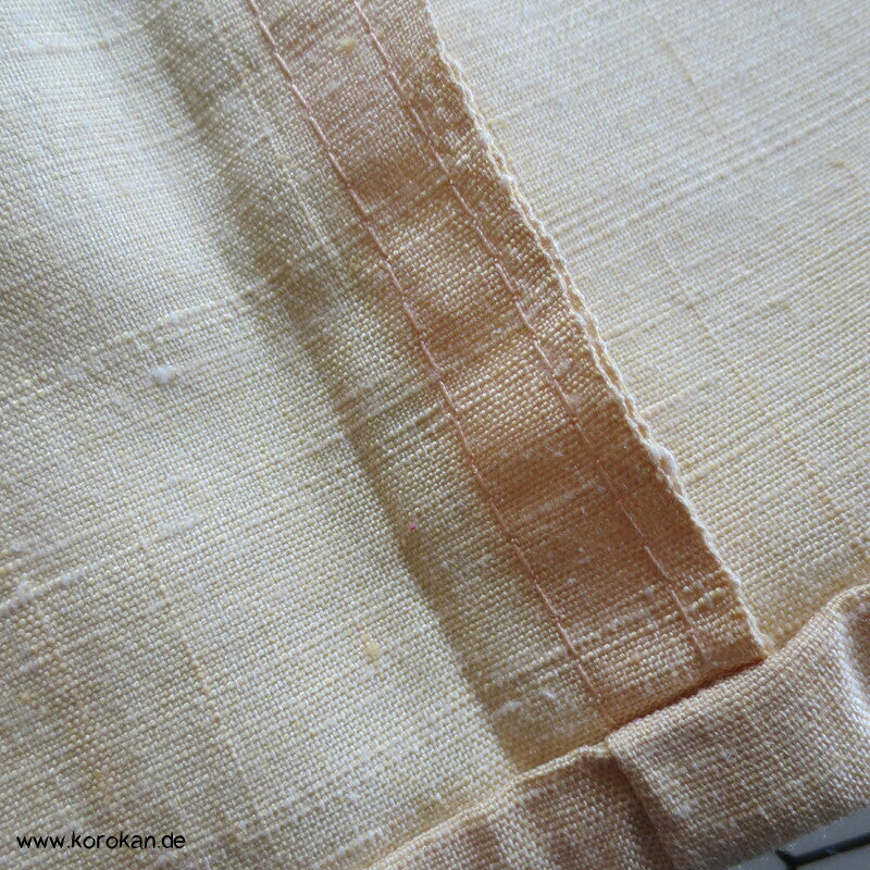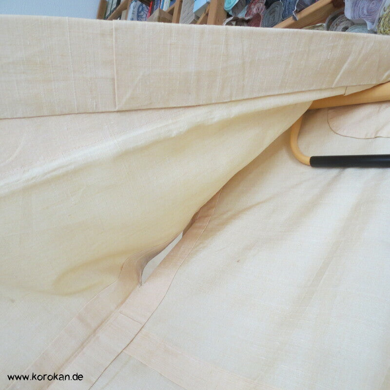 Vintage Hitoe ungefütterter Tsumugi Seiden Kimono mit wenigen Kasuri garngefärbt eingwebten Kreisen in orange auf creme