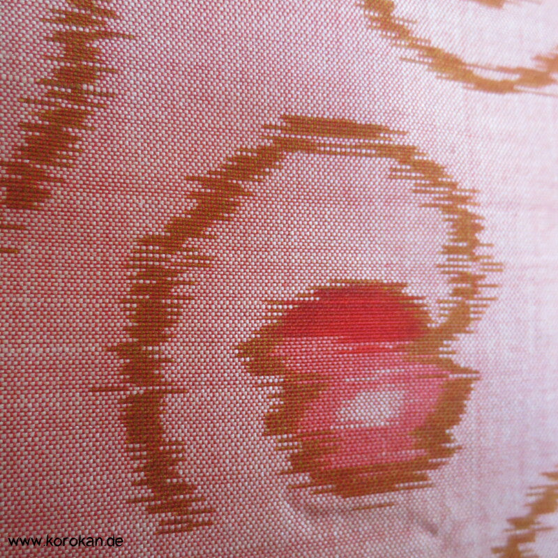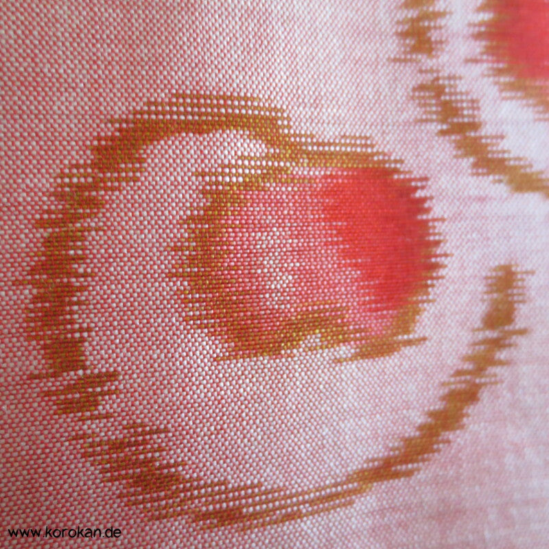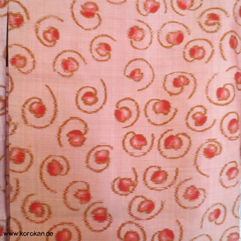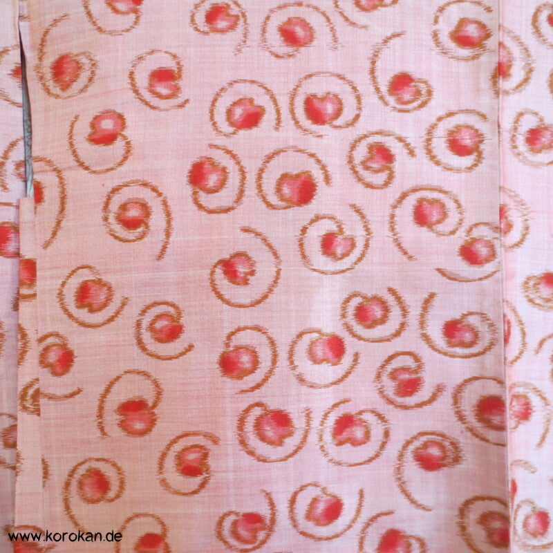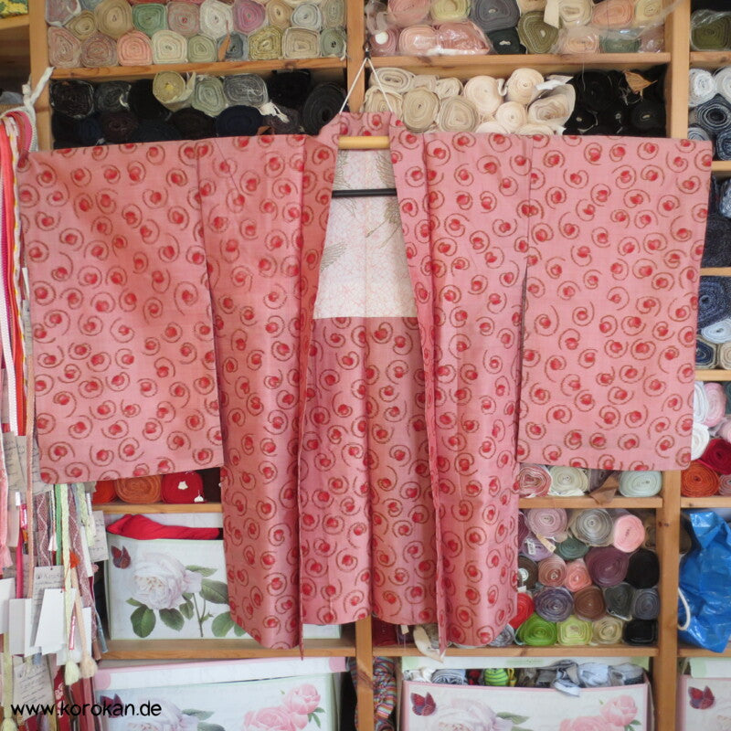 Vintage, eher antike Haori Kimono Jacke aus Seide Kasuri Meisen gewebt, kleine Kringel auf rosa mit Kranich Futter.