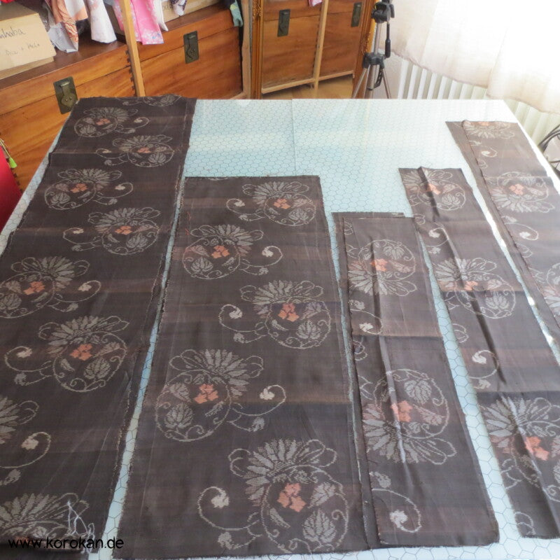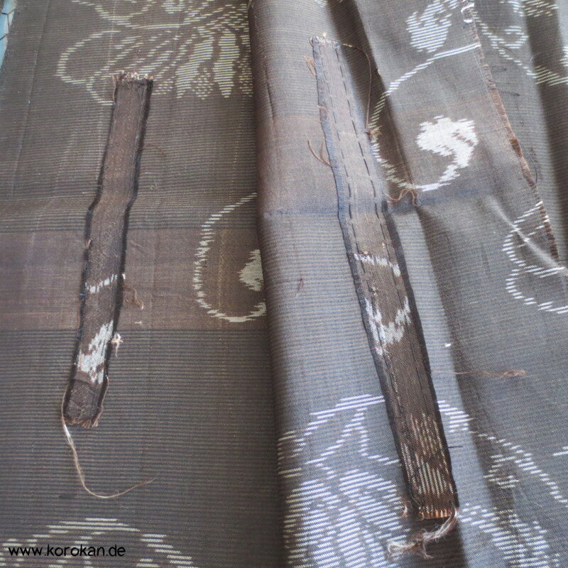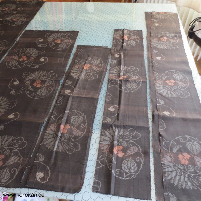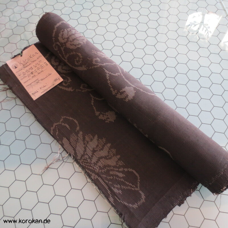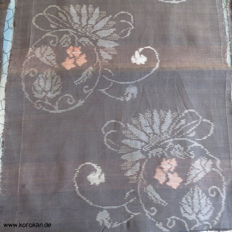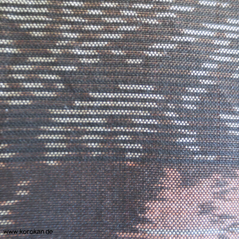Vintage Araihari japanischer Kasuri Meisen Seiden Kimono Stoff aus einem aufgetrennten ungefütterten Kimono mit Blumenkugelkringeln auf dunkelbraun - Boro, schon stark mitgenommen, mit vielen Flickstellen - die Teile dazwischen sind gut nutzbar