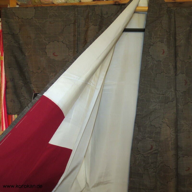 Vintage Tsumugi Seiden Komon Kimono Kasuri Kugel Chrysanthemen und Blätter, oberes Futter hell, unteres Hakkake Futter in dunkelroter Seide