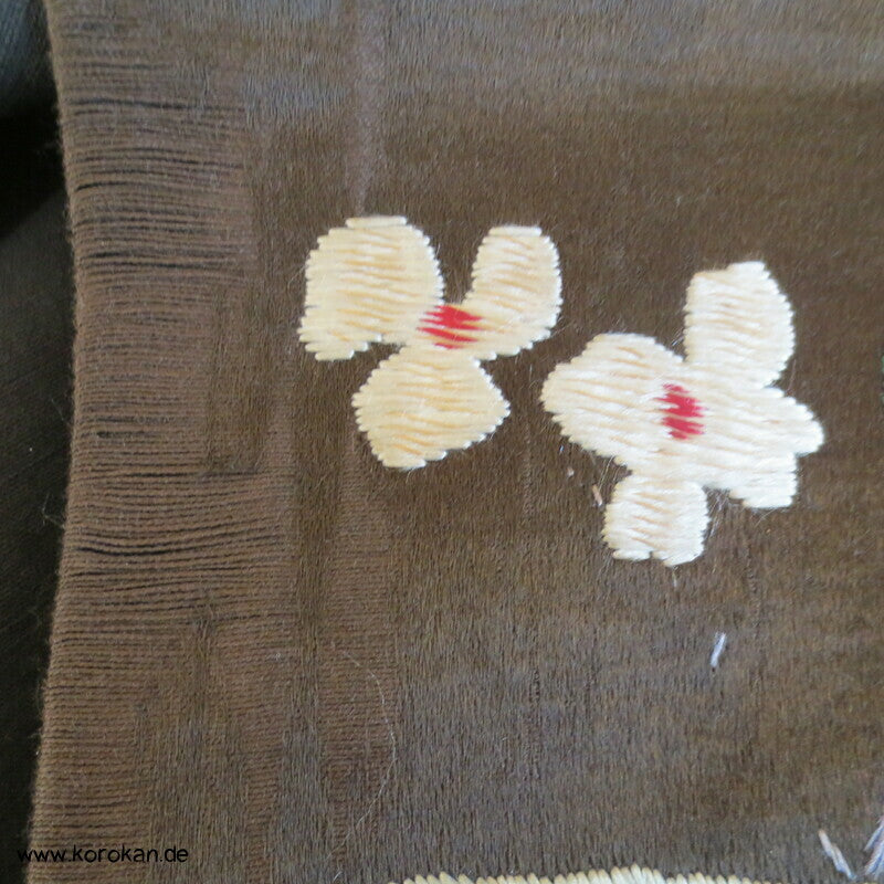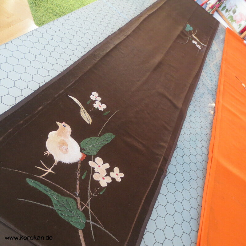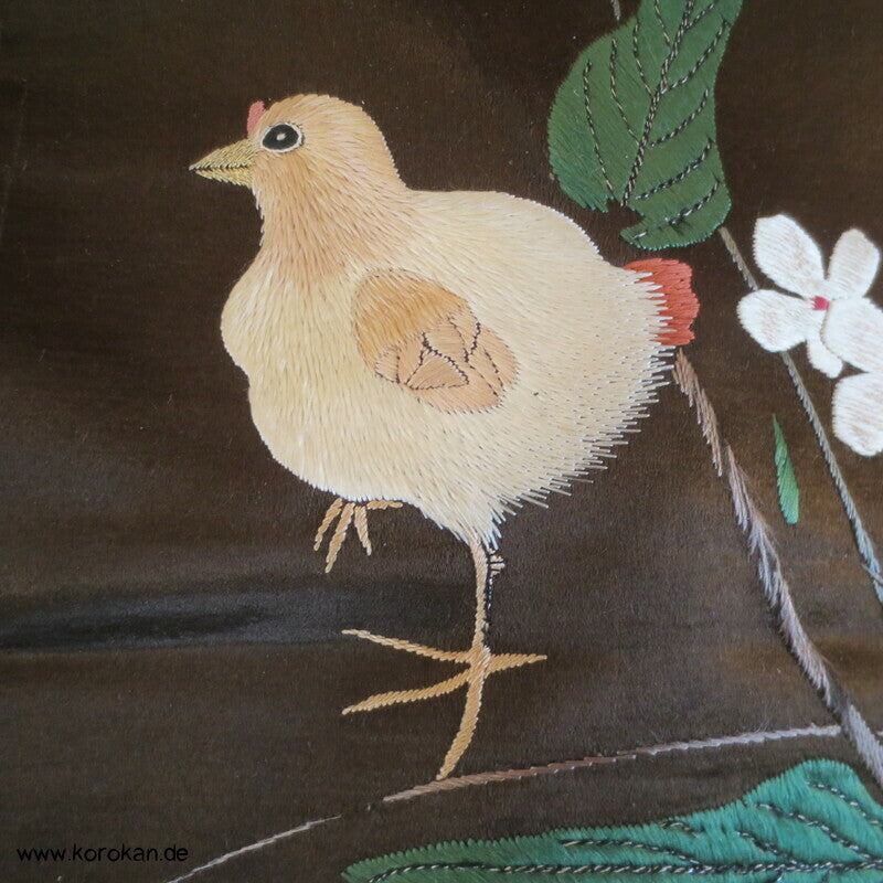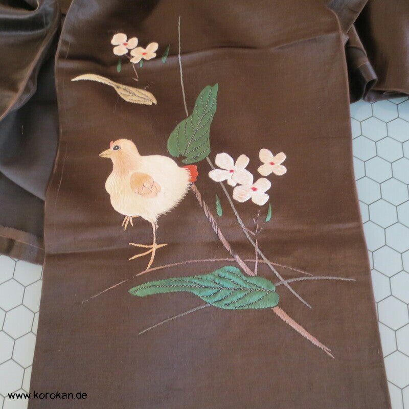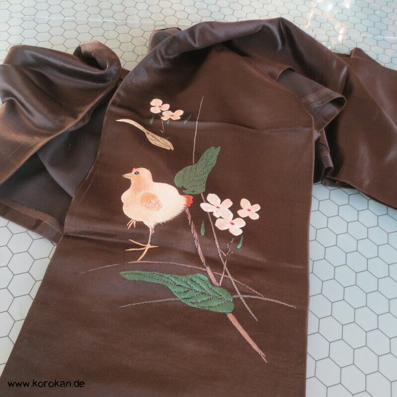 Antiker aufgetrennter klassischer schwarzer Seidensatin Obi bestickt mit einem Küken zwischen Blättern und Blüten