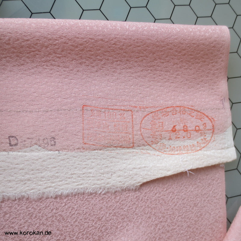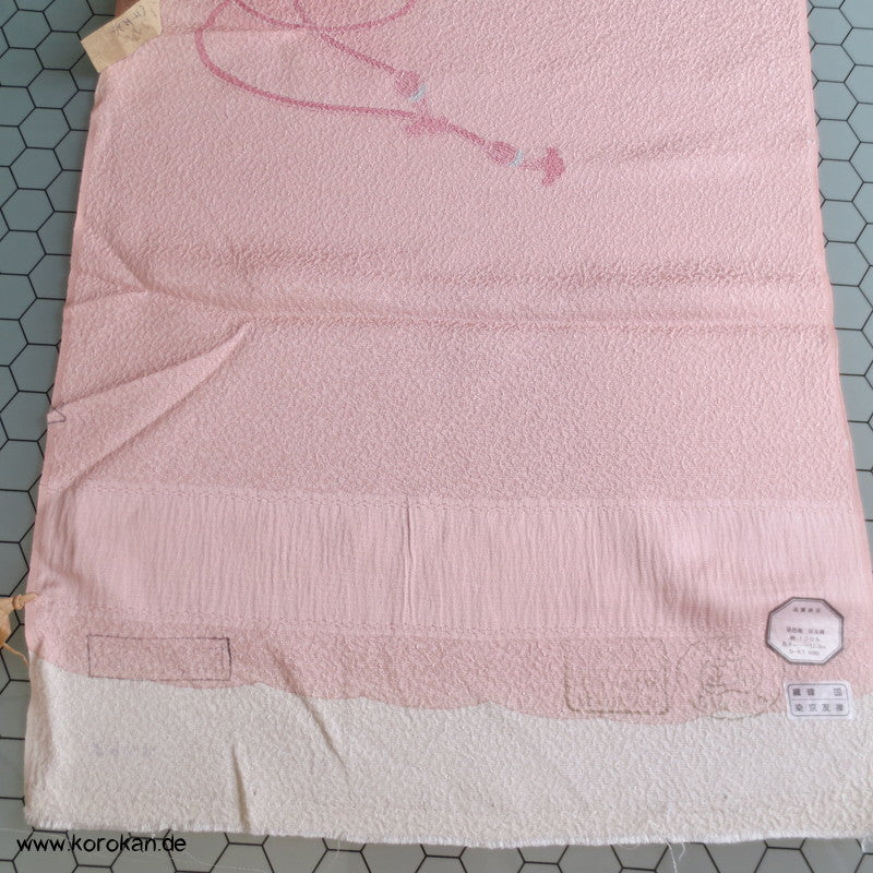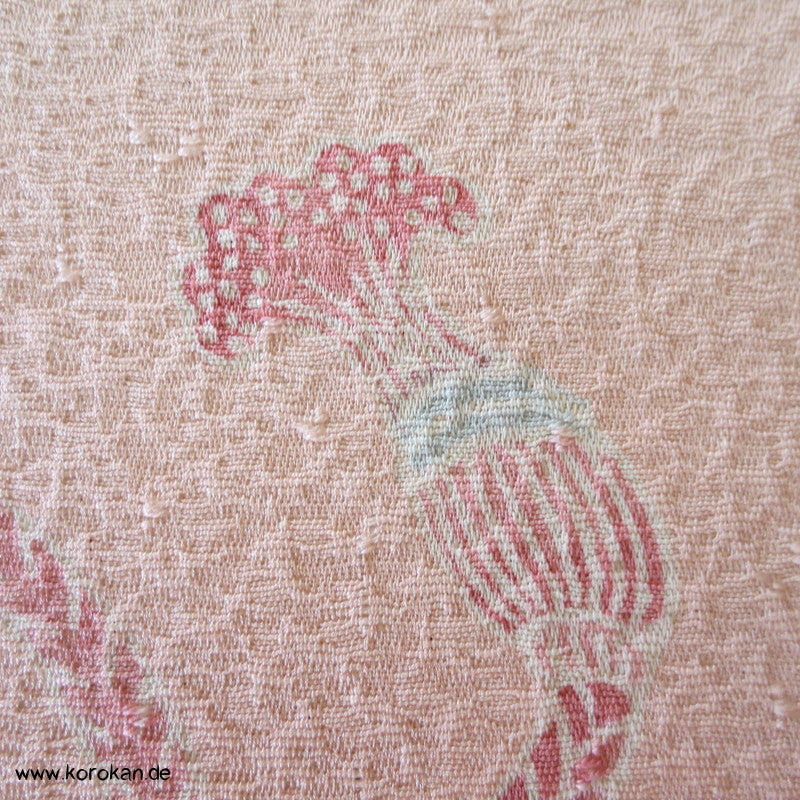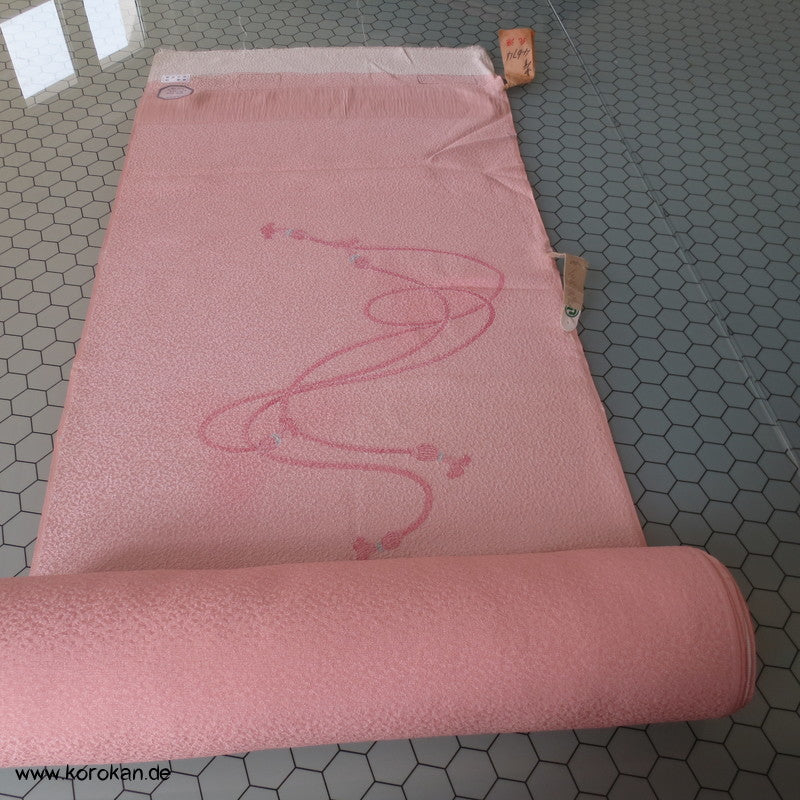 Vintage unbenutzter japanischer Stoffballen Damast Seide mit Blumenkugeln und Flechtbändern für einen ganzen Homongi Kimono. Das Muster ist unregelmäßig im Stoff verteilt und wird erst durch das genaue Zusammensetzen der Bahnen ein ganzes Bild.