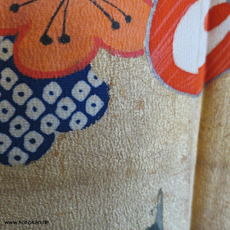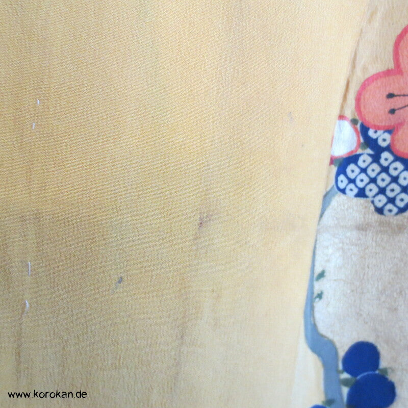 Vintage, eher antiker Furisode Seidencrepe sehr kleiner / Mädchen, kleine Frauen Kimono bunt mit Wellen und Blumenkugeln auf Murasaki lila mit viel Goldauflage