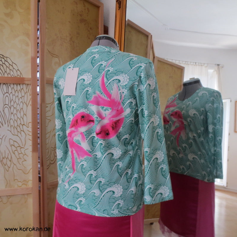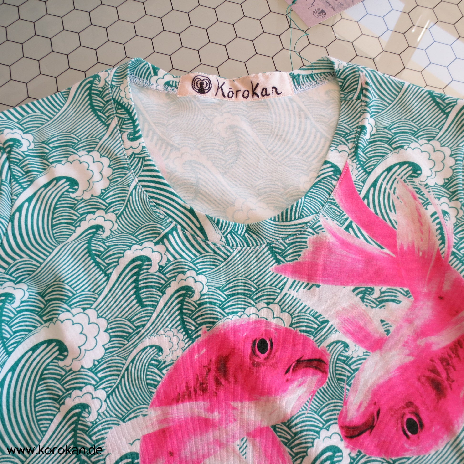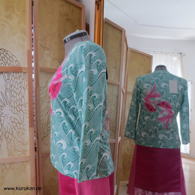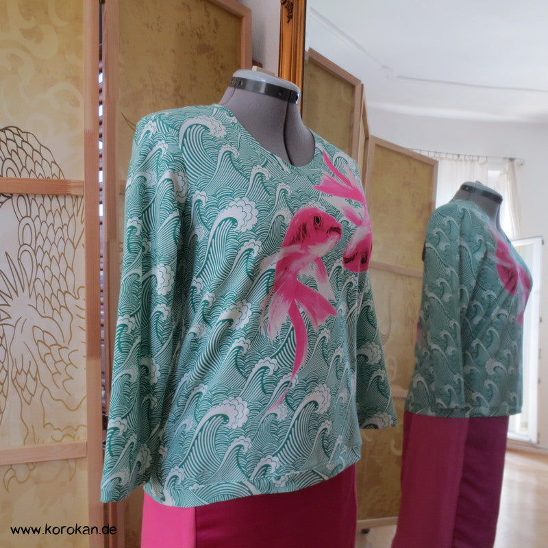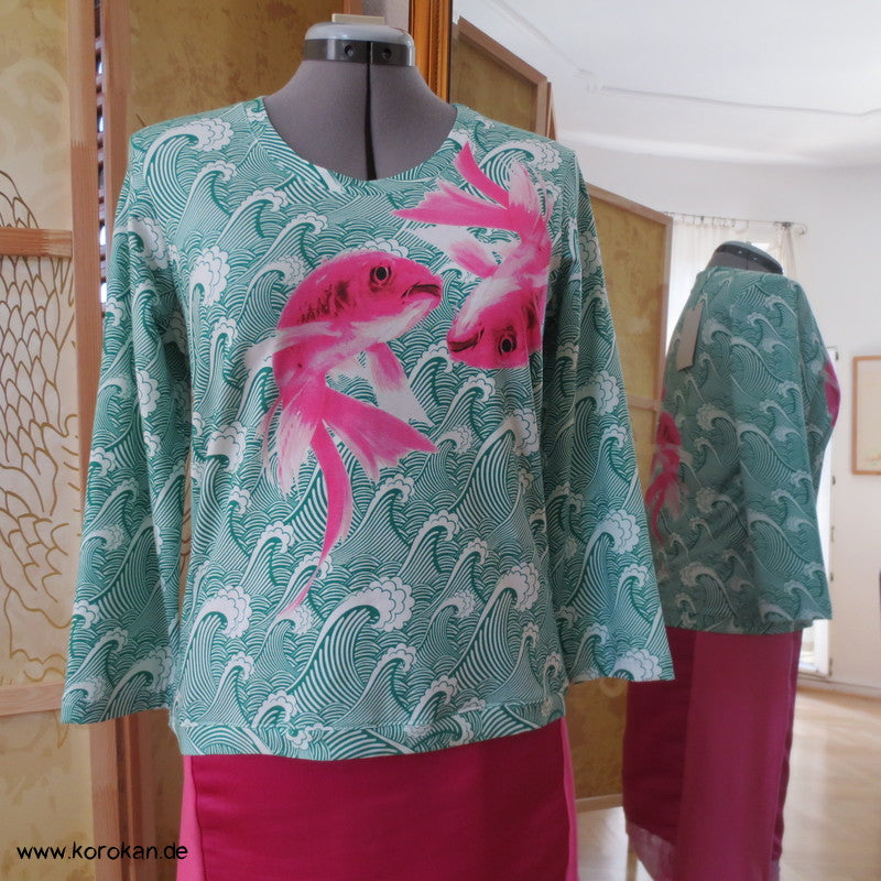 Stretch Baumwolljersey Koi Shirt pink in grünen Wellen