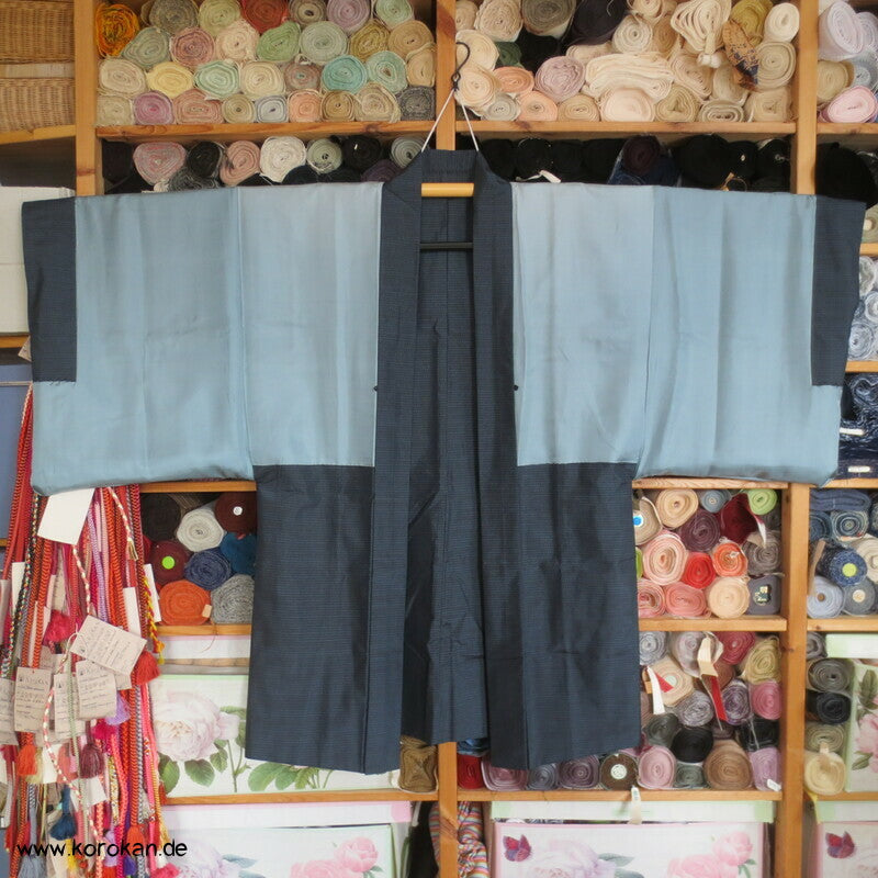 Vintage japanische Männer Haori aus hellblau - grauer feiner Kasuri garngefärbter fein karierter Tsumugi Seide mit Seidenfutter mit Flößermotiv
