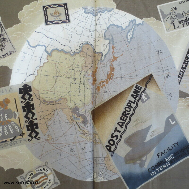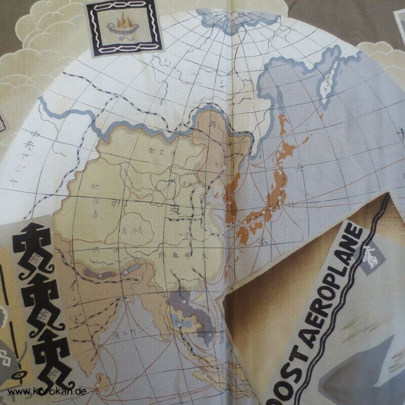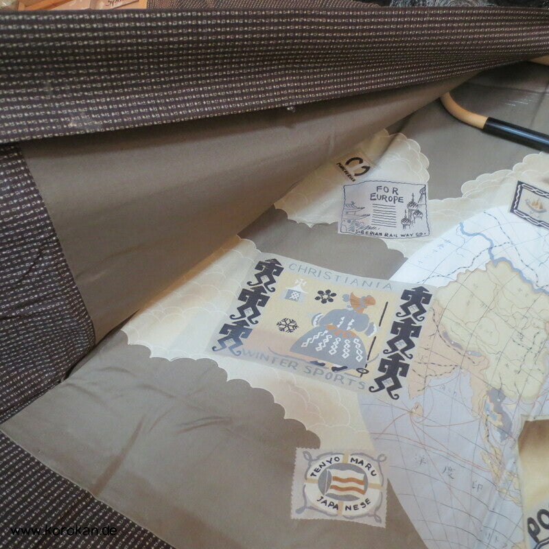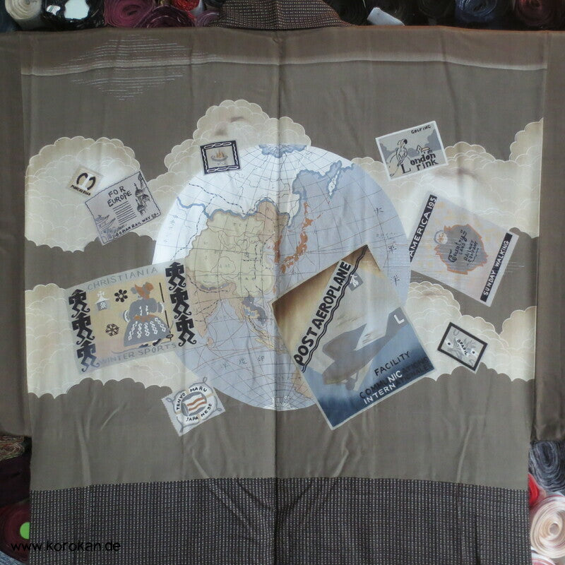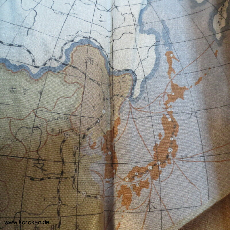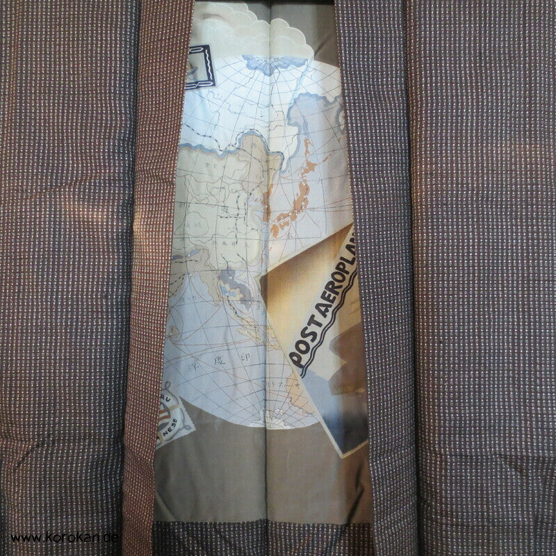 antike japanische Männer Haori aus Kasuri Tsumugi Seide mit Manchuko Weltkarte Seidenfutter mit Postkartendruck..... eindeutig Vorkriegsware... sehr selten, antik, kleine Schäden, nur als Ausstellungsstück