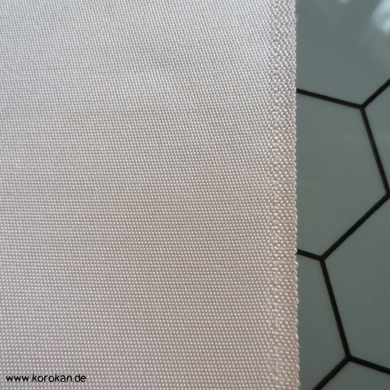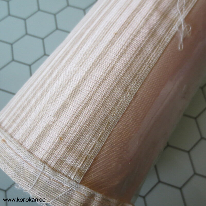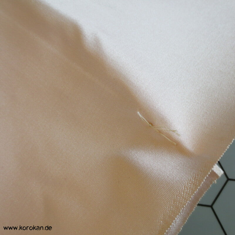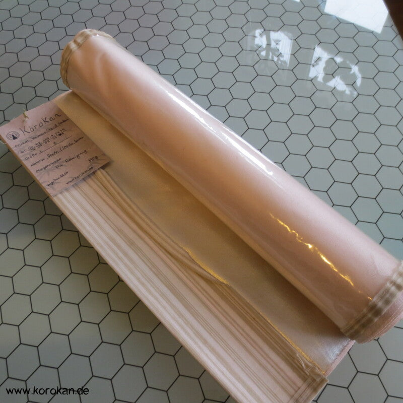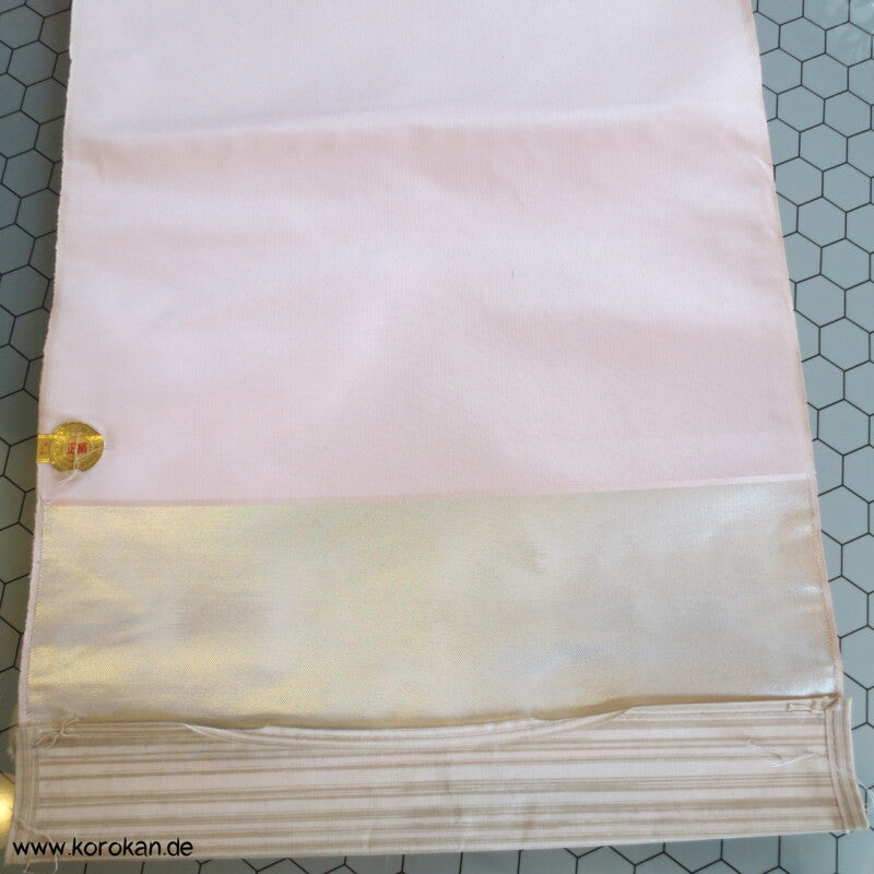 Vintage unbenutzer Tanmono für einen Obi, volle Stoffrolle Seidenjacquard / -brokat in kieselrosa glänzend mit Mandarinenten zwischen Blüten und Kikko auf einem Wellenschwung für Nagoya