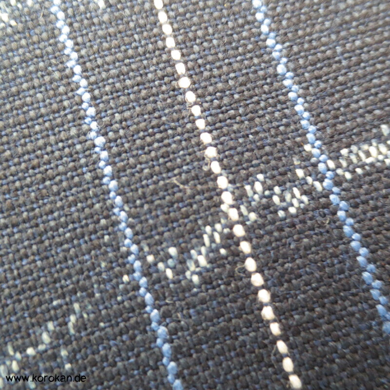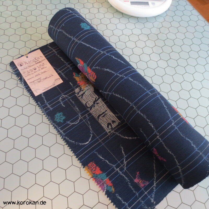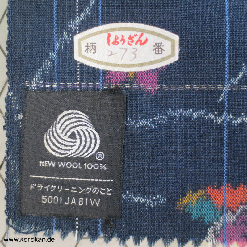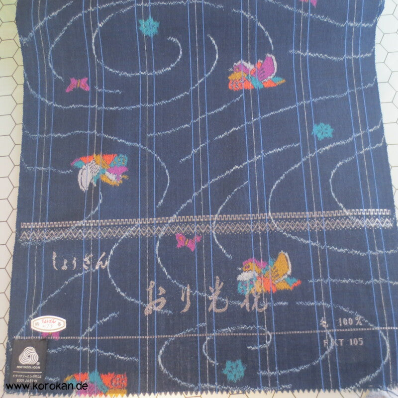 japanische Vintage unbenutzte Stoffrolle Tanmono Wolle Kasuri Mandarinenten auf dunkelblau mit Wellenkringeln