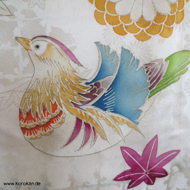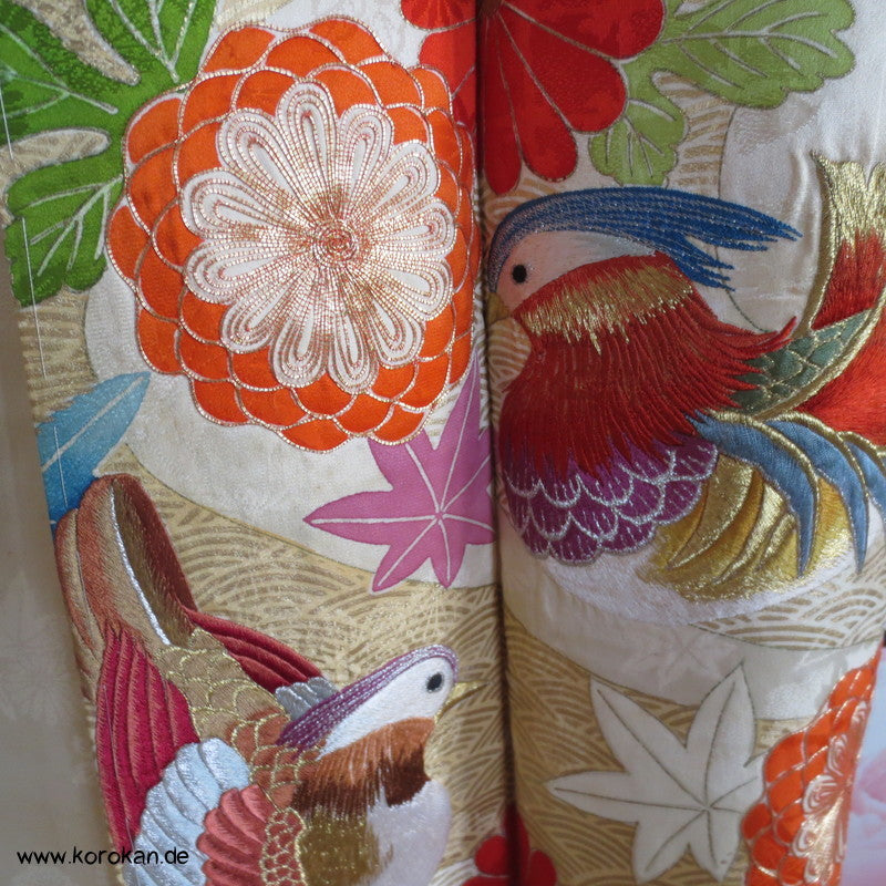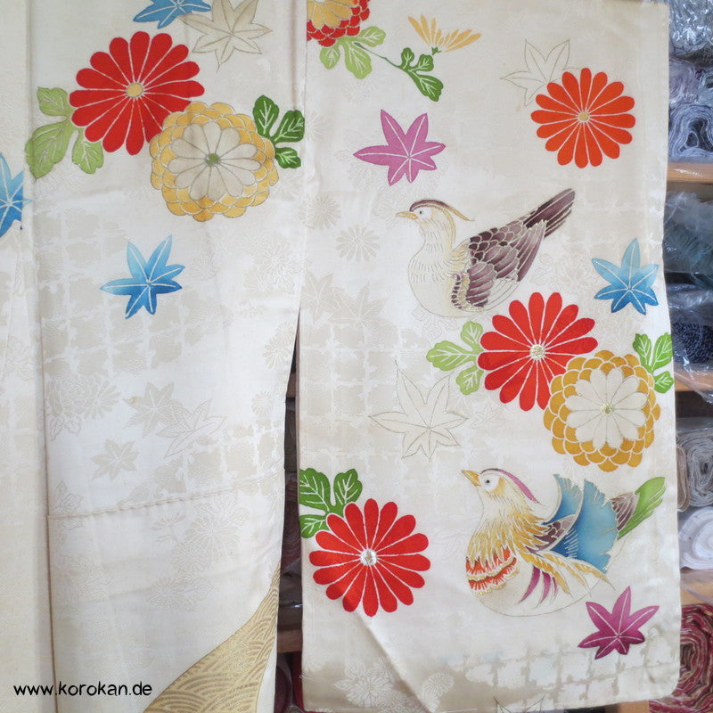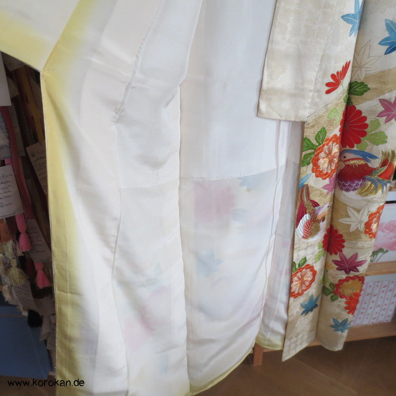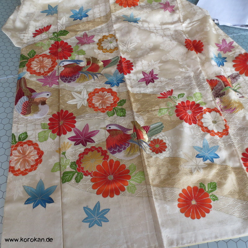 Vintage Homongi Kimono Seidendamast, bestickt mit Mandarinenten zwischen Blumen, feinem oberen Seidenfutter und unterem Hakkake mit hellgelbem Verlaufsrand Seidenfutter.