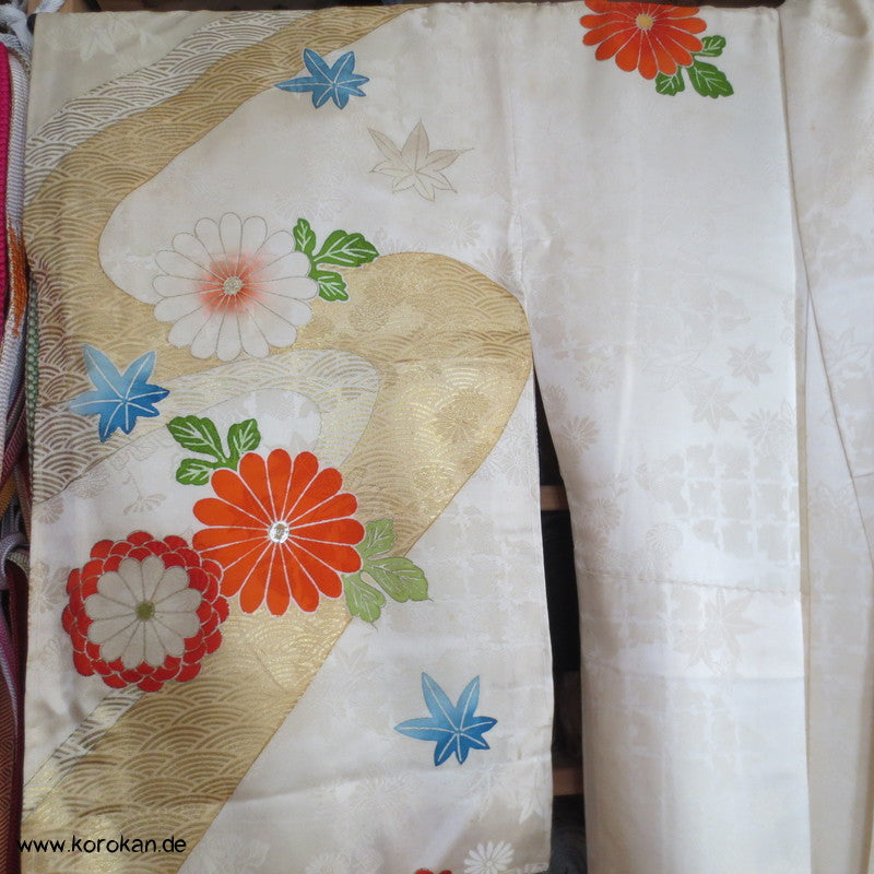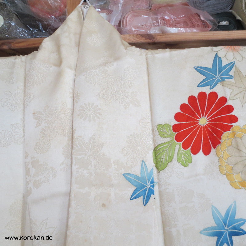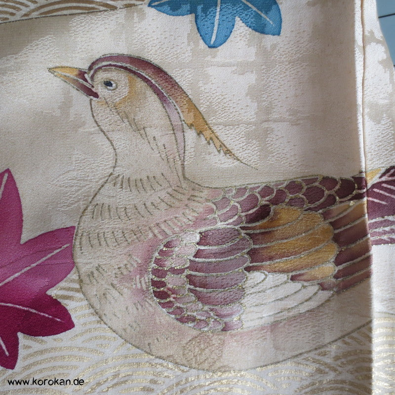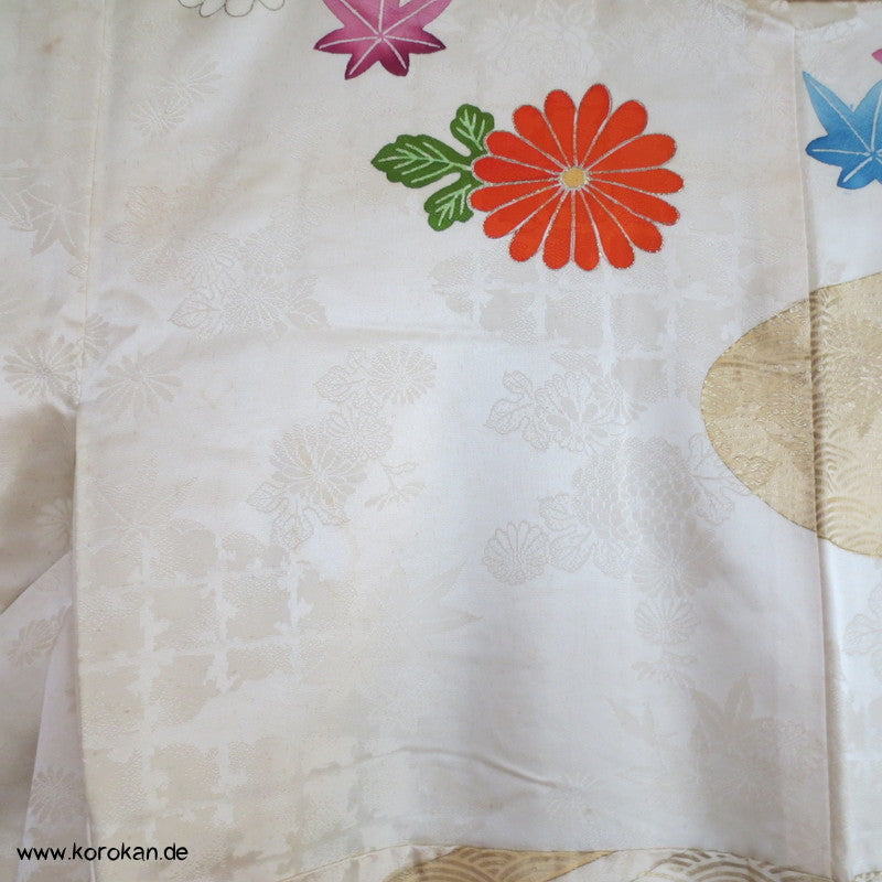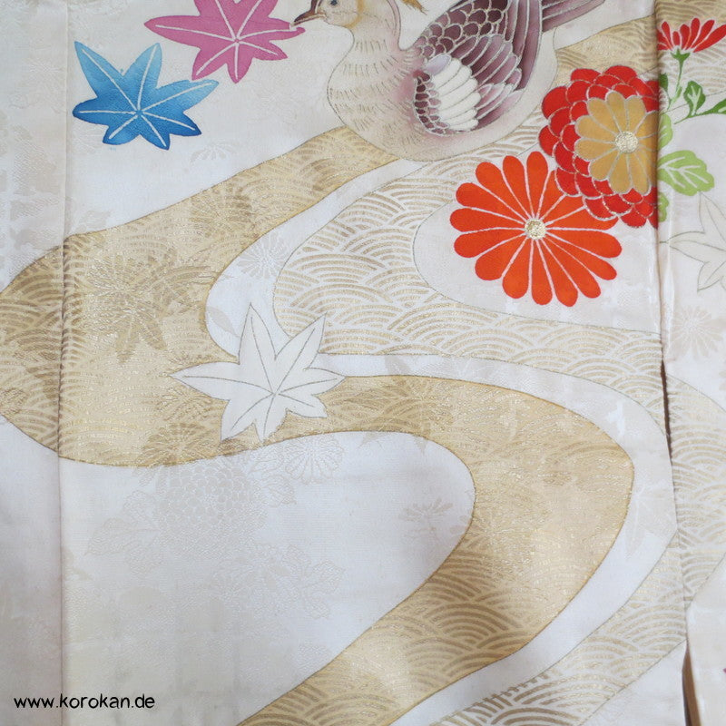 Vintage Homongi Kimono Seidendamast, bestickt mit Mandarinenten zwischen Blumen, feinem oberen Seidenfutter und unterem Hakkake mit hellgelbem Verlaufsrand Seidenfutter.