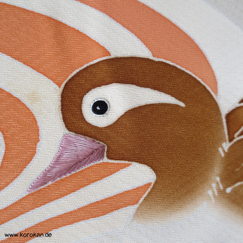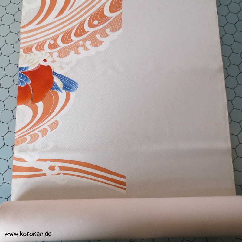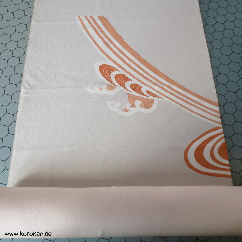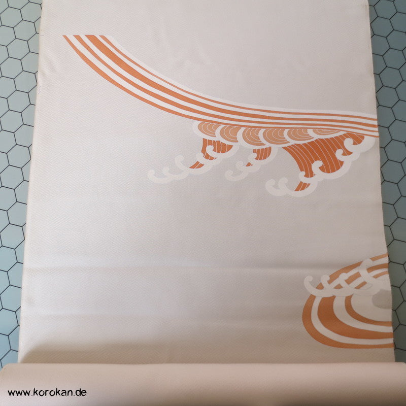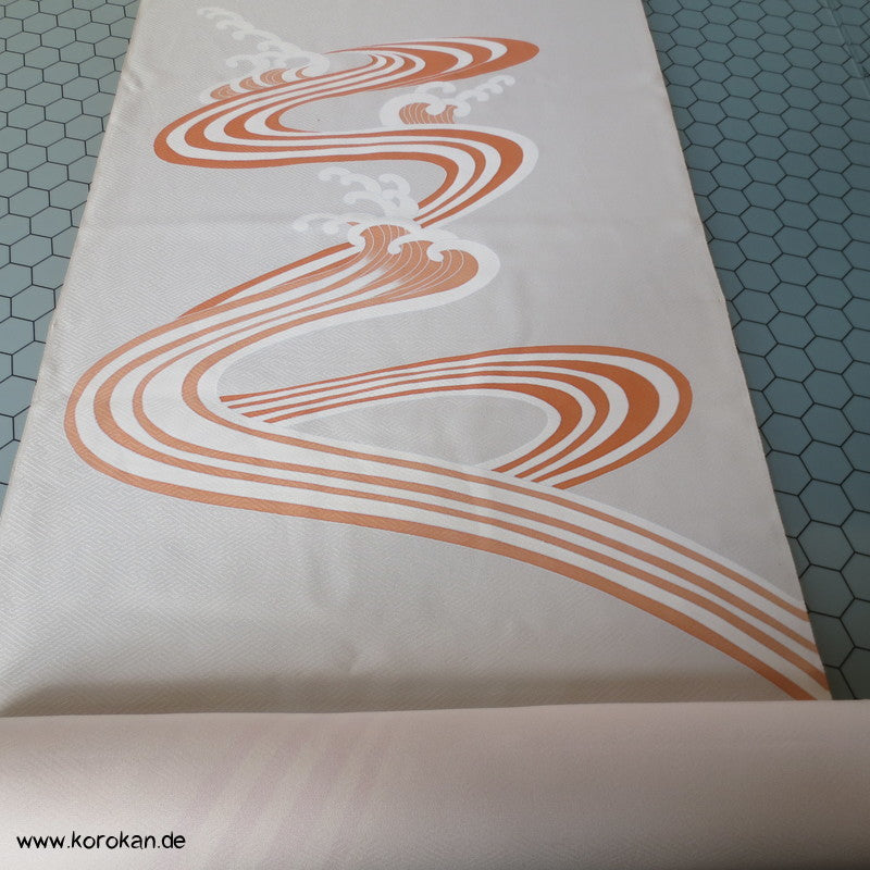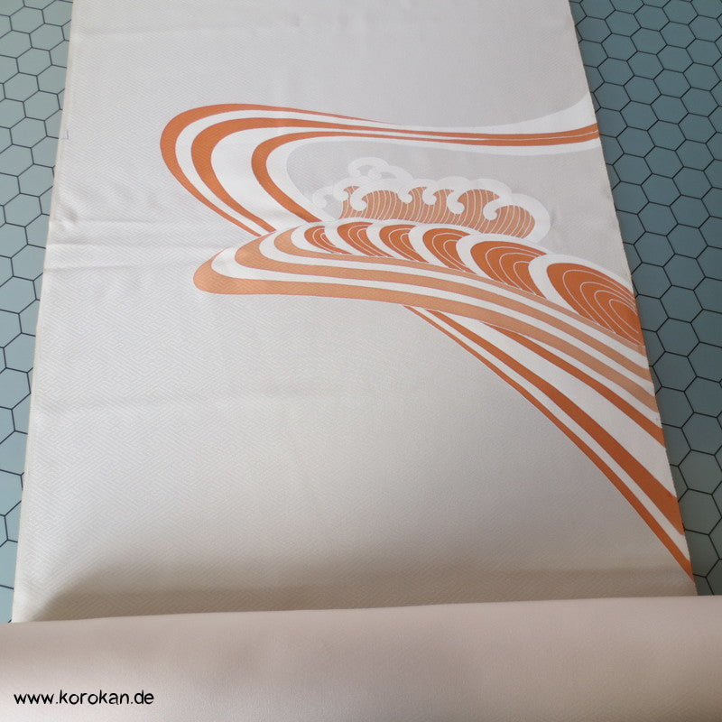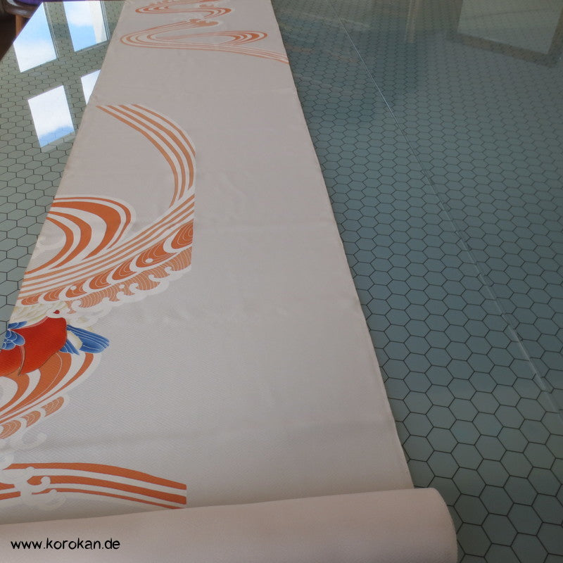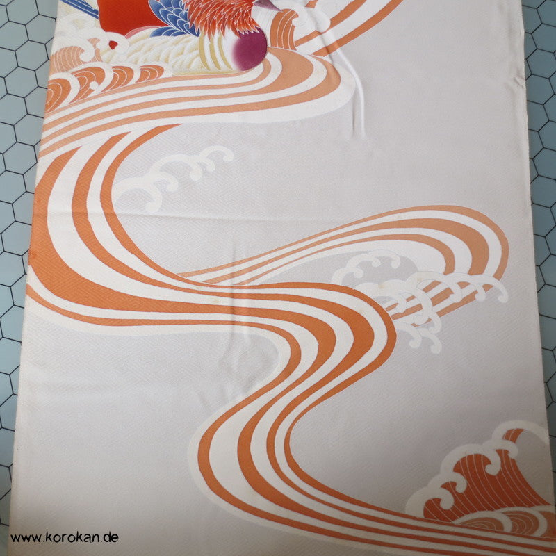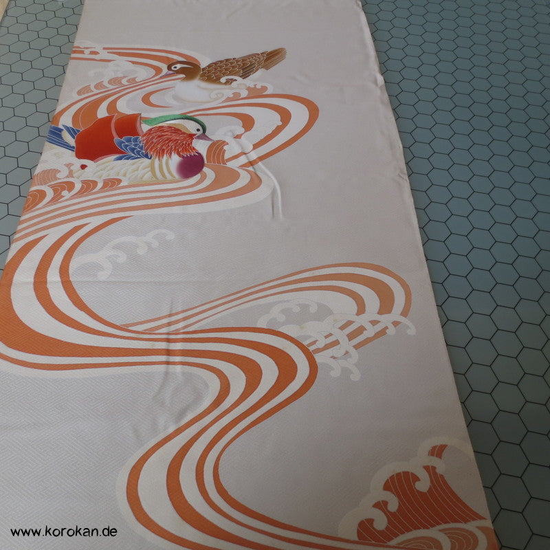 Vintage unbenutzter japanischer Stoffballen dicke Damast Seide mit einem kaum sichtbaren Sayagata Muster, bemalt mit Wellen und einem Mandarinentenpaar, teilbestickt für einen ganzen Homongi Kimono. Das Muster ist unregelmäßig im Stoff verteilt und wird erst durch das genaue Zusammensetzen der Bahnen ein ganzes Bild.