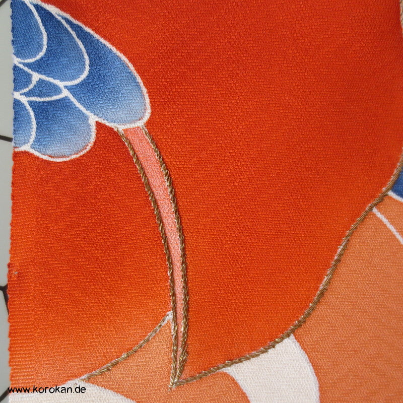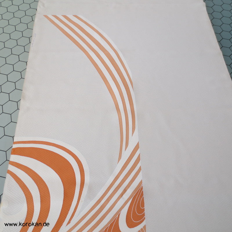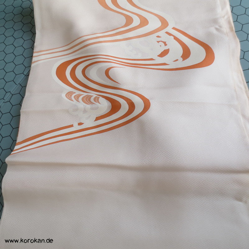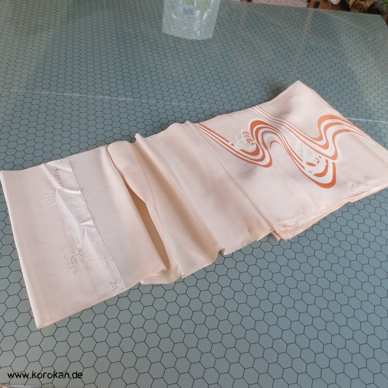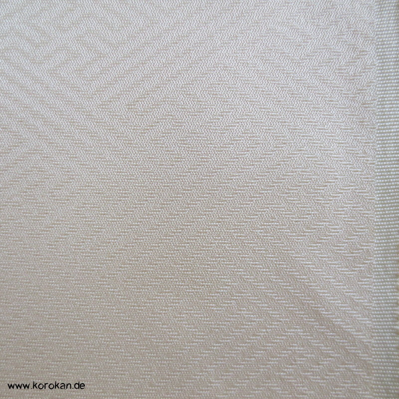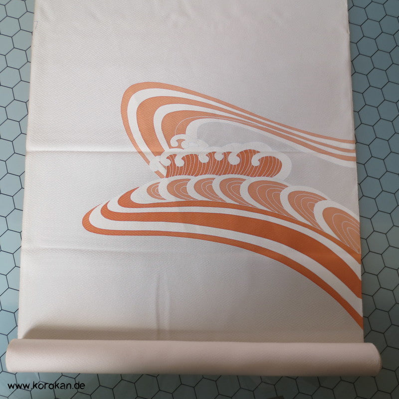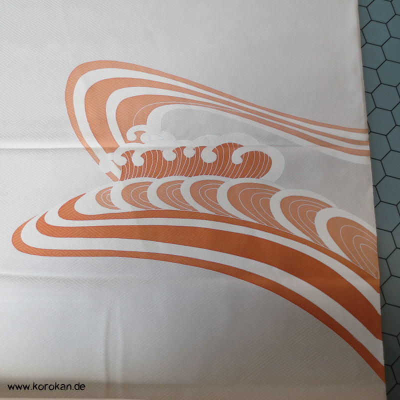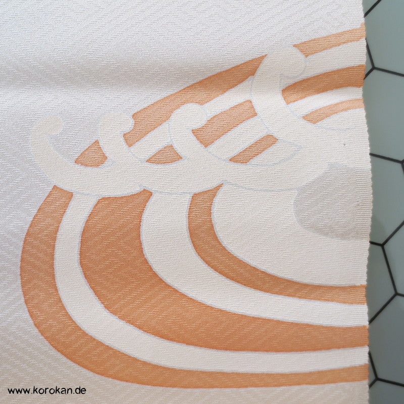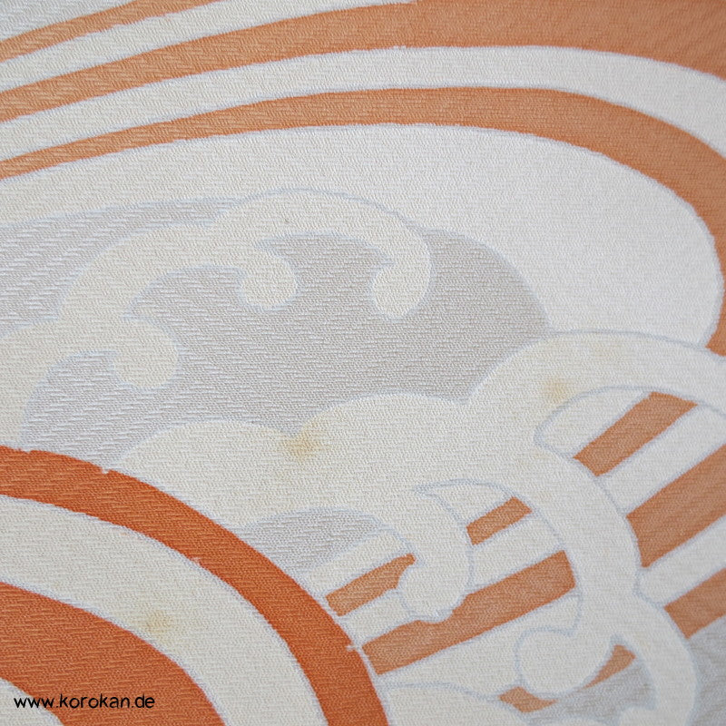 Vintage unbenutzter japanischer Stoffballen dicke Damast Seide mit einem kaum sichtbaren Sayagata Muster, bemalt mit Wellen und einem Mandarinentenpaar, teilbestickt für einen ganzen Homongi Kimono. Das Muster ist unregelmäßig im Stoff verteilt und wird erst durch das genaue Zusammensetzen der Bahnen ein ganzes Bild.