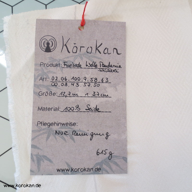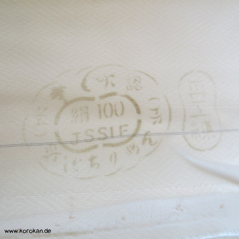 100 % Seide, Mit Seidenstempeln, die weiße Farbe in den Malereien hat teilweise Vergilbungen, das geht erfahrungsgemäß auch durchs Waschen nicht raus.