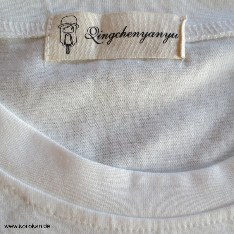 neues China Tshirt mit Japan Druck, vorne drauf steht "süße Katze" und an der Seite winkt eine Maneki Neko, halb und halb vorne und hinten