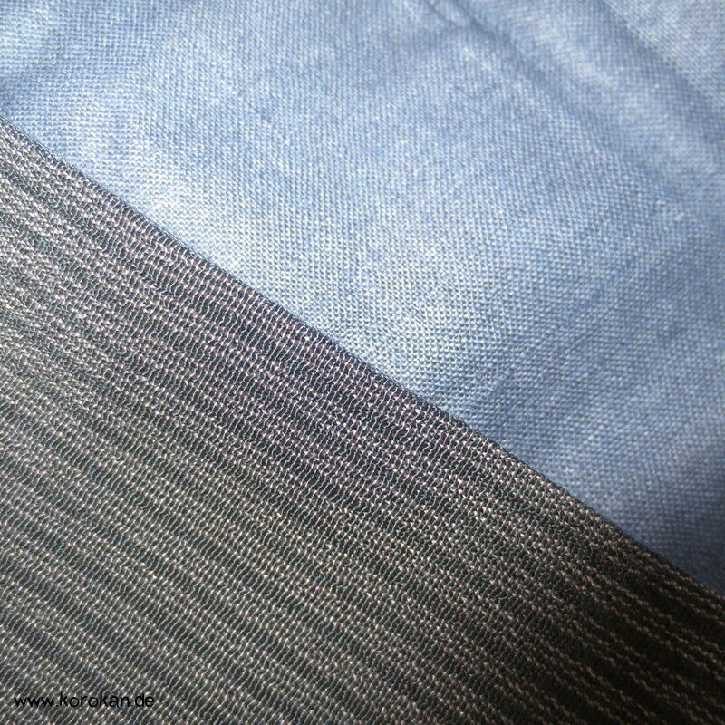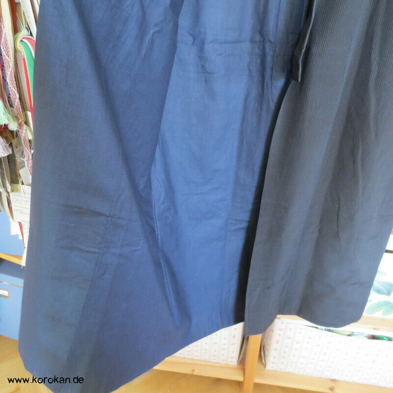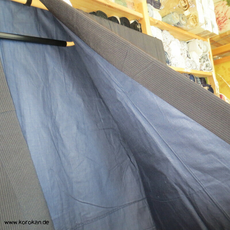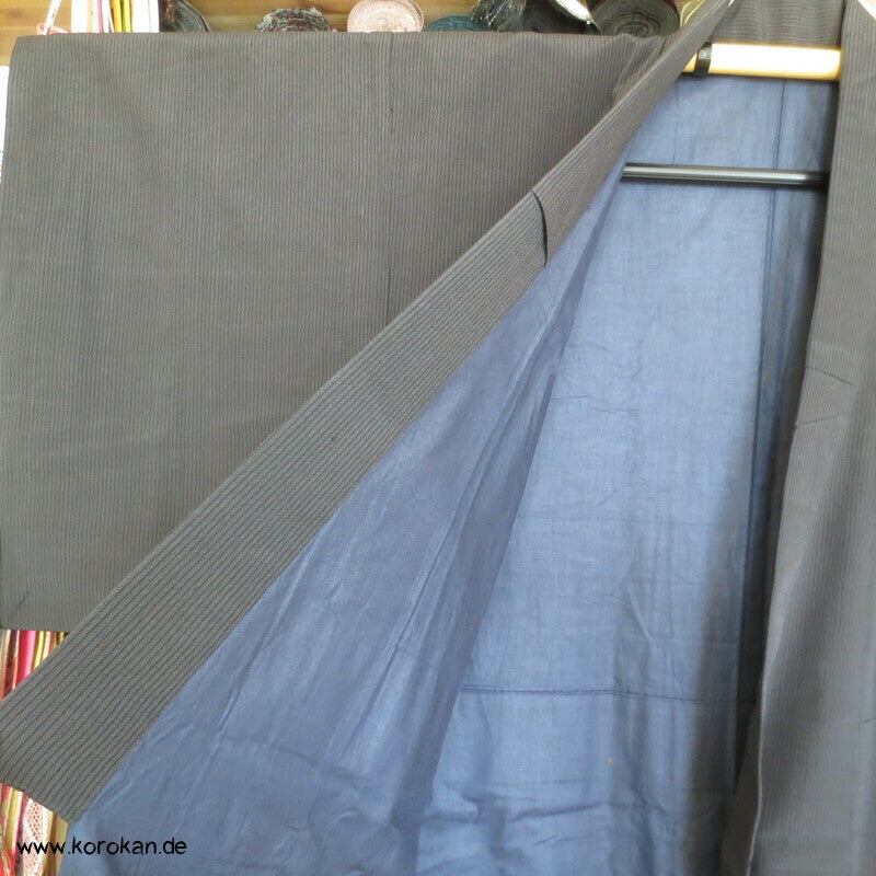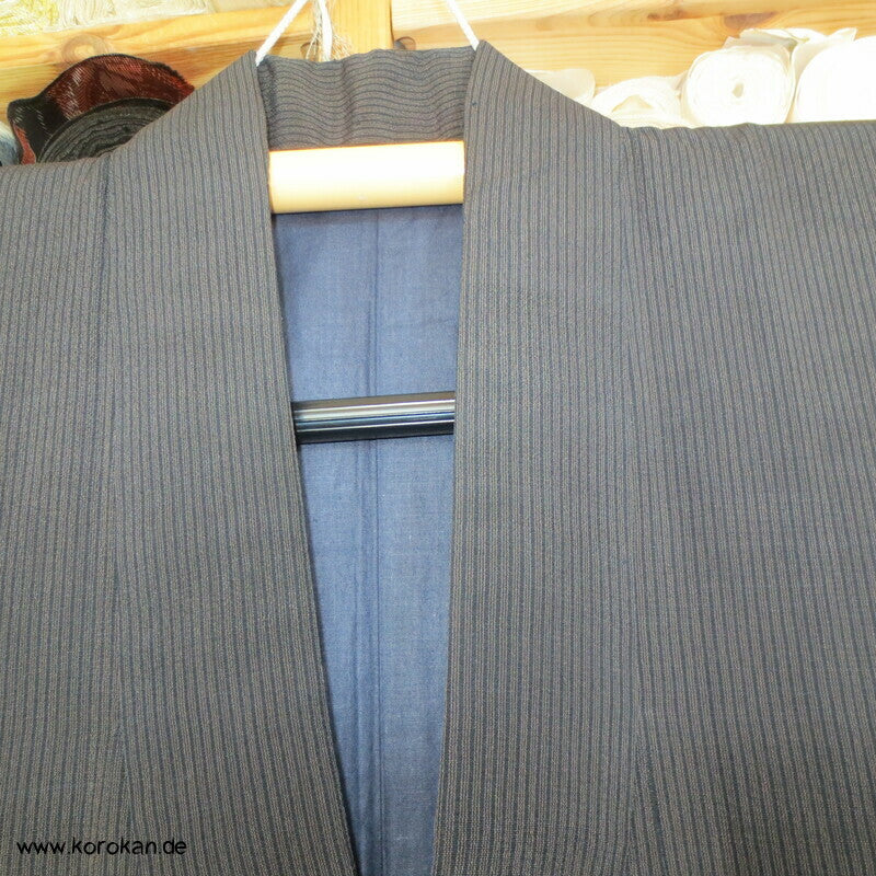 Vintage Männer fein gestreifte Crepe Seide anthrazit grau Kimono, mit blauem Baumwoll Chintz Futter. Der Klassiker.