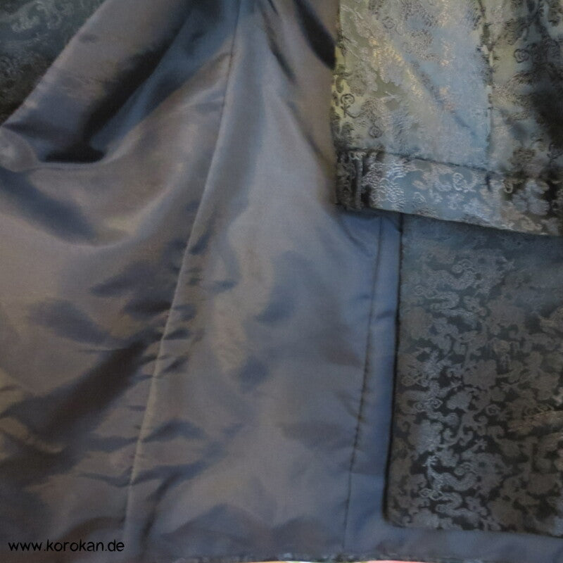 Vintage maßangefertigter Herren China Drachen Seide Stehkragen Anzug schwarz glänzend - sehr fein gearbeitet, Etikett entfernt, wie neu, scheint nur einmal getragen worden zu sein.