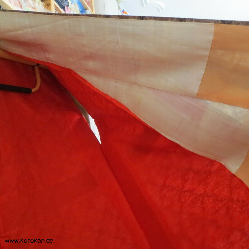 Vintage, eher antiker Kasuri garngefärbtes Webmuster Matzukawabishi Borkenzacken Tsumugi Seide Komon, oberes Futter helle und rote Seide, unteres Hakkake Futter lachs Seide