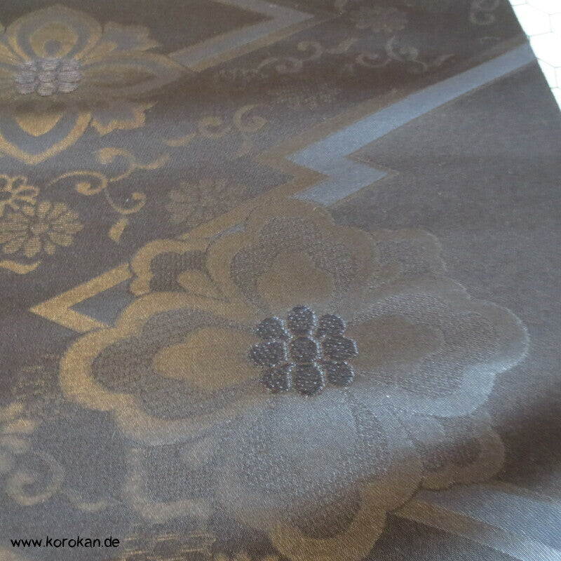 Vintage unbenutzter neuer Jacquard Seidenjacquard für Obi mit eingewebten Matzukawabishi Pinien Borke und stilisierten Blüten schwarz changierend