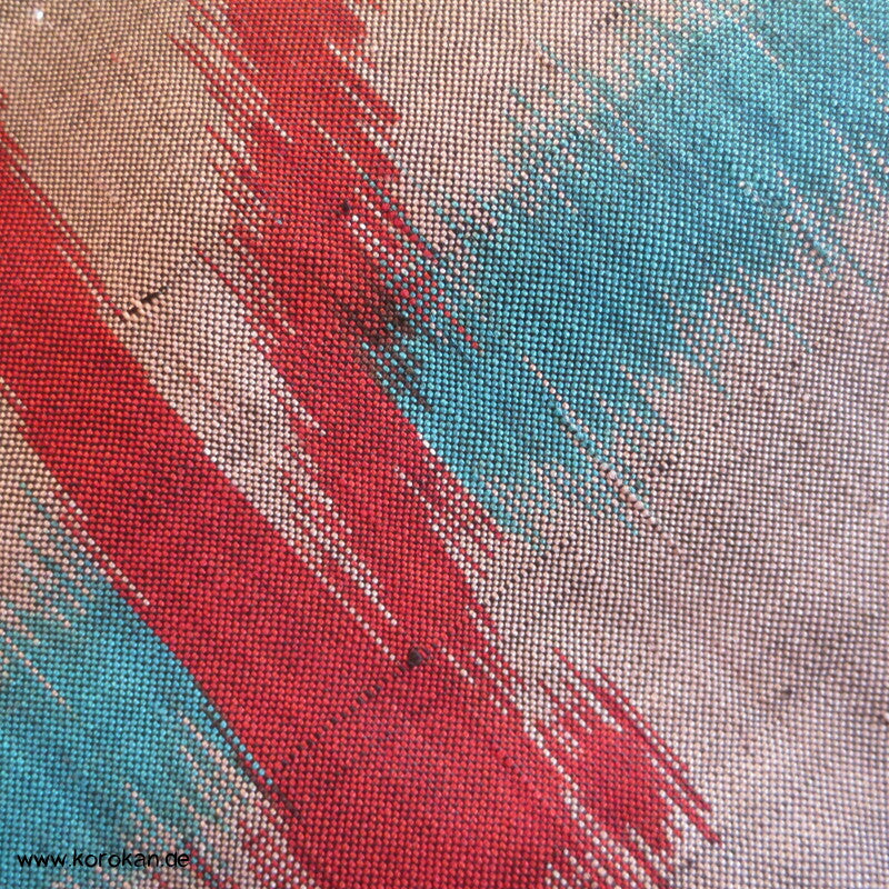 Vintage, eher antiker Meisen Seiden Komon Kasuri riesige Kiefernnadeln in rot und türkis auf taupe, oberes Futter rote Baumwolle, unteres Hakkake Futter zitronengelbe Seide