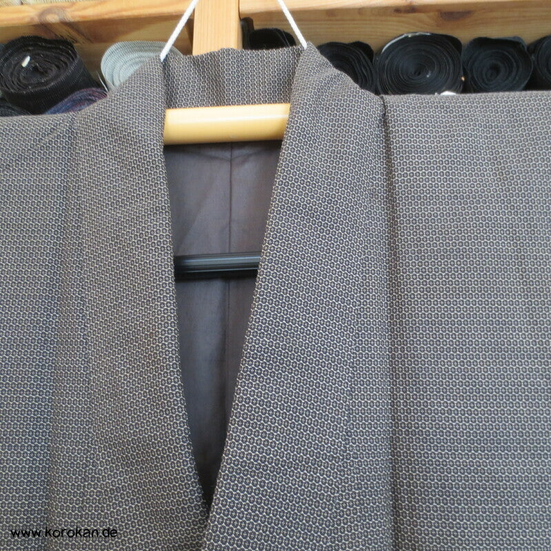 Vintage Männer Tsumugi Wolle / Seiden Jacquard Kikko Kimono schwarzbraun beige, mit grauem Baumwoll Chintz Futter. Der Klassiker.