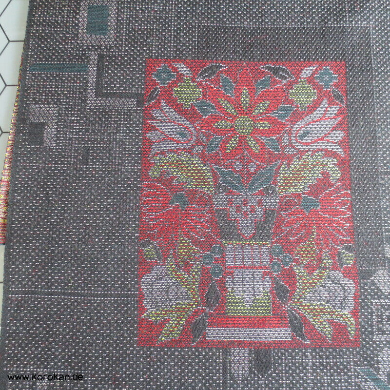 Vintage Araihari Kimono Wollmischgewebe Jacquard Stoffrest, schwarz mit Shikishi Blumentopf sehr geometrisch