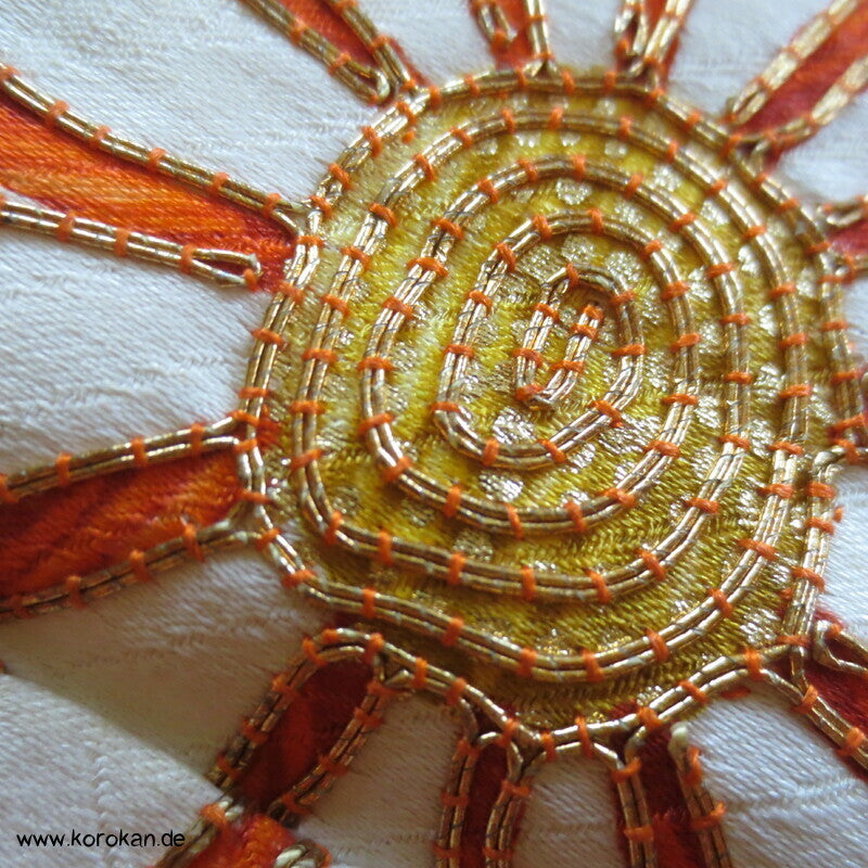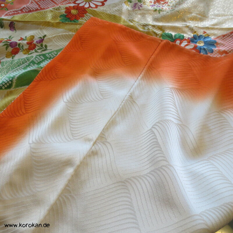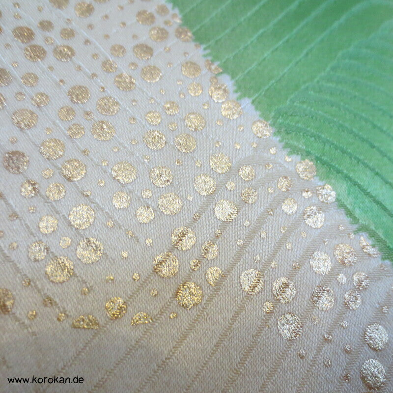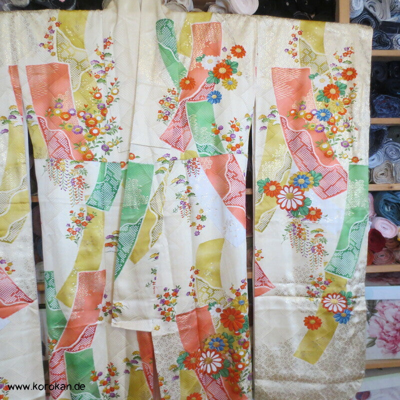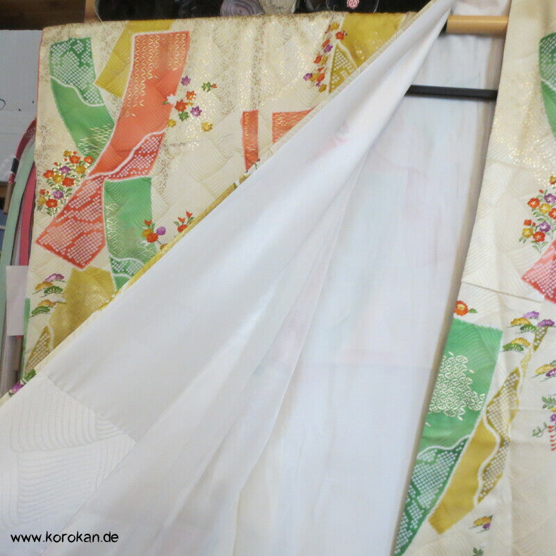 japanischer Vintage Furisode Kimono von Mitzukoshi, feiner Wellen Seidendamast mit Tanzashi oder Tagasode Muster, auf jeden Fall hängende Stoff oder Papierbahnen mit Blüten mit Gold bestickt, oberes Futter helle Seide, unteres Futter mit Bokashi Verlaufsrand