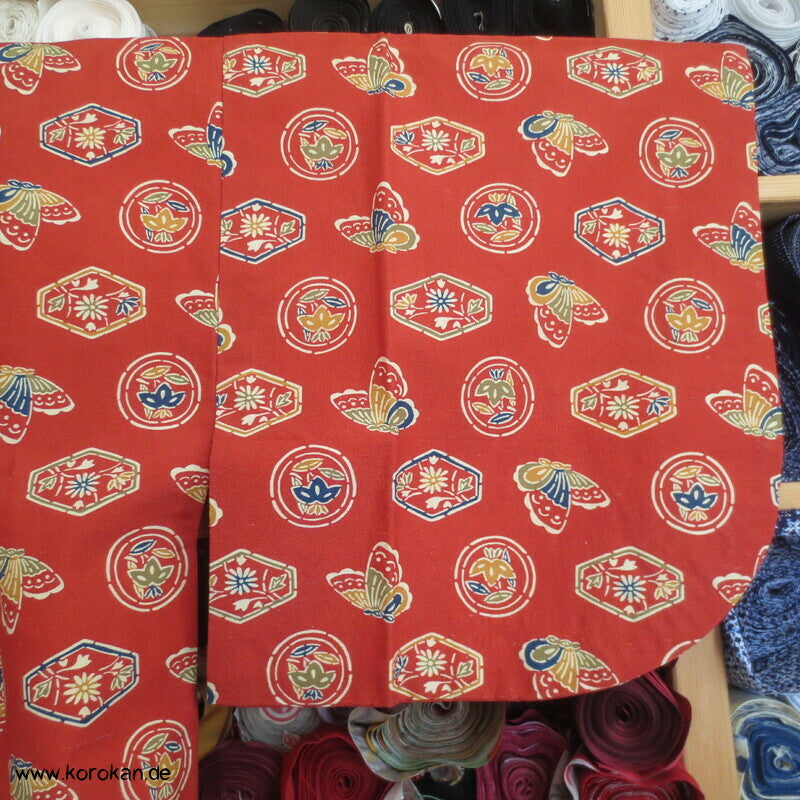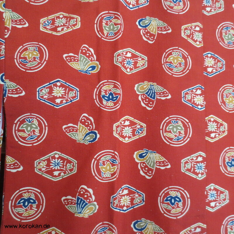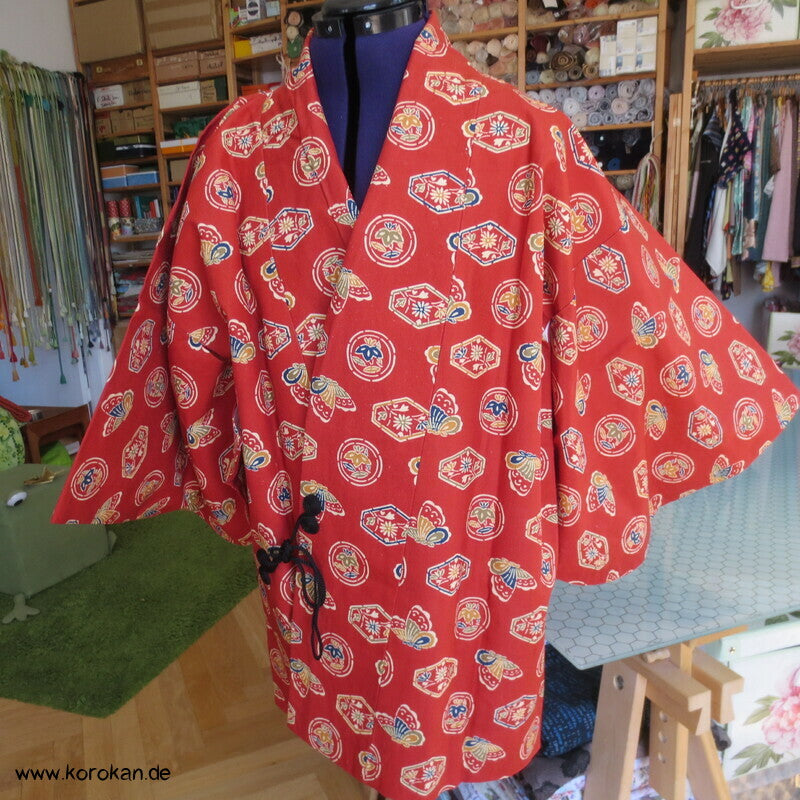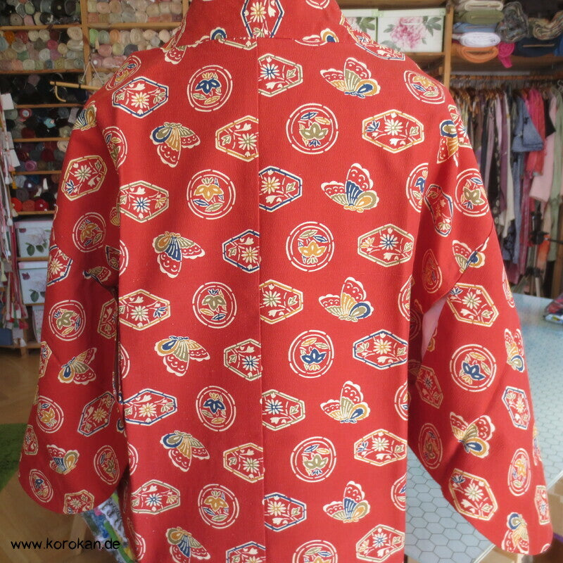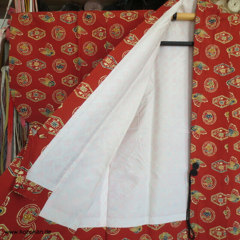 japanische Vintage Dochugi Kimono Jacke lauter Symbole und Schmetterling auf persimmon rot