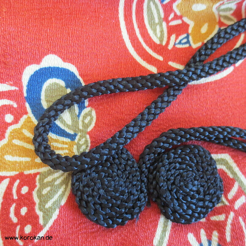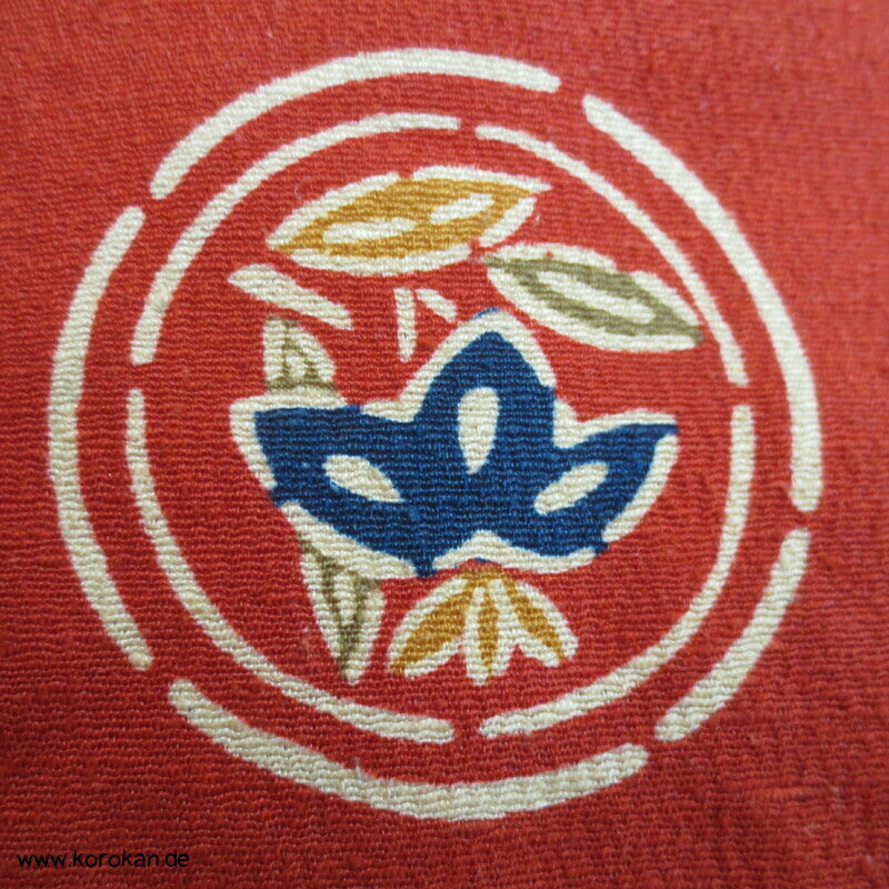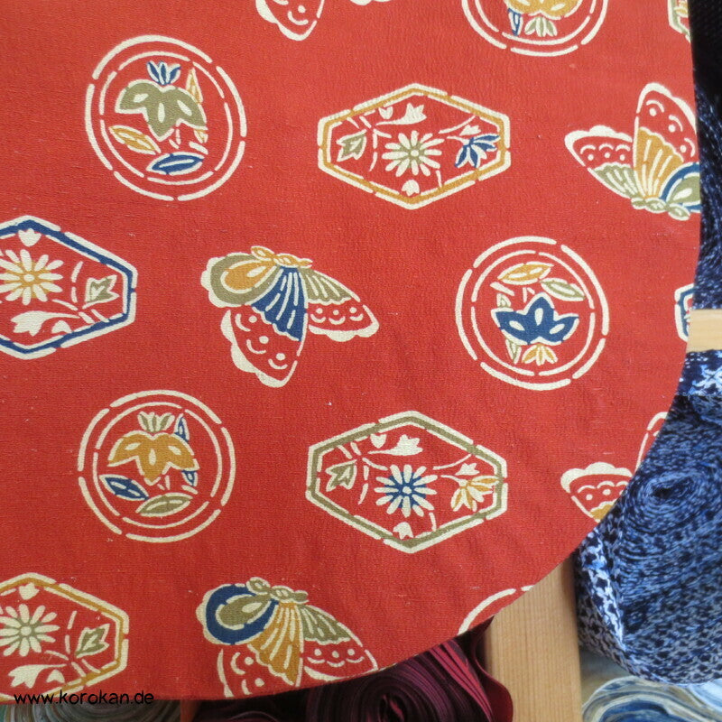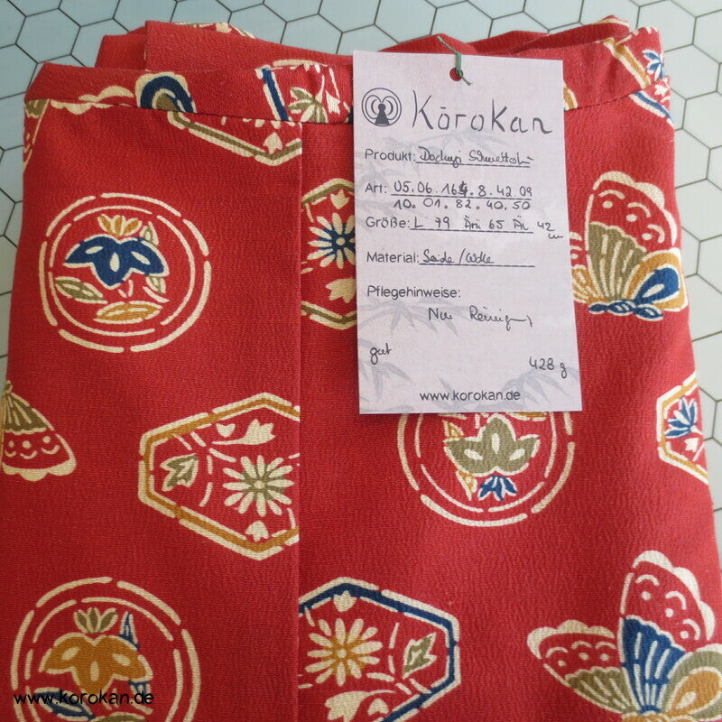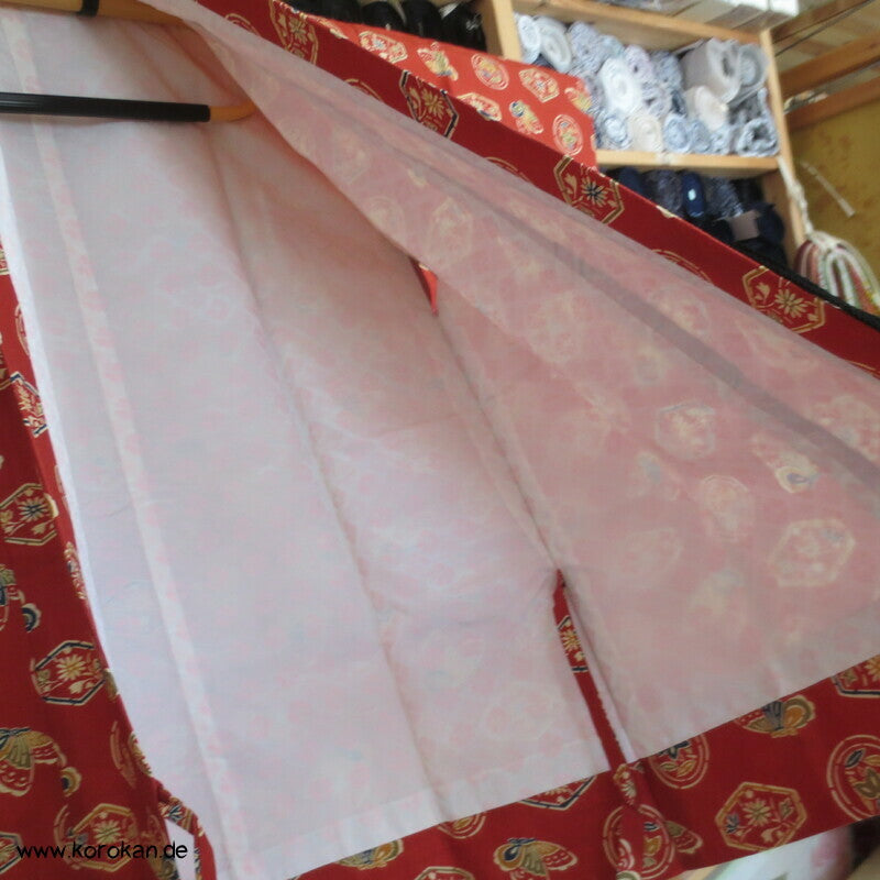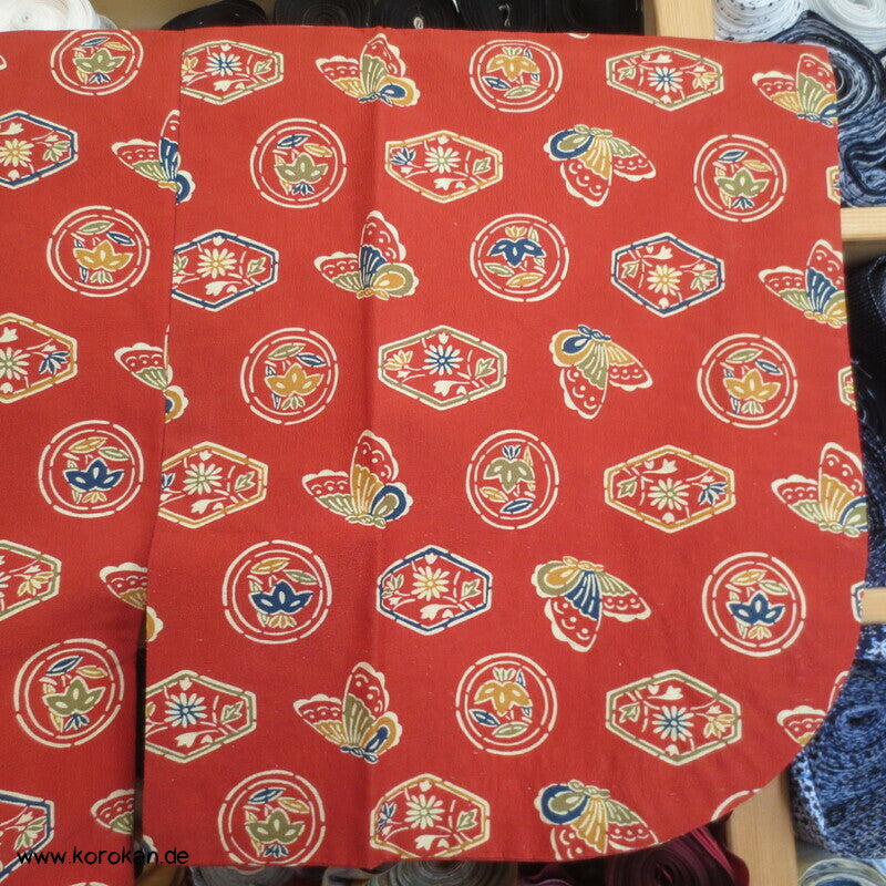 japanische Vintage Dochugi Kimono Jacke lauter Symbole und Schmetterling auf persimmon rot
